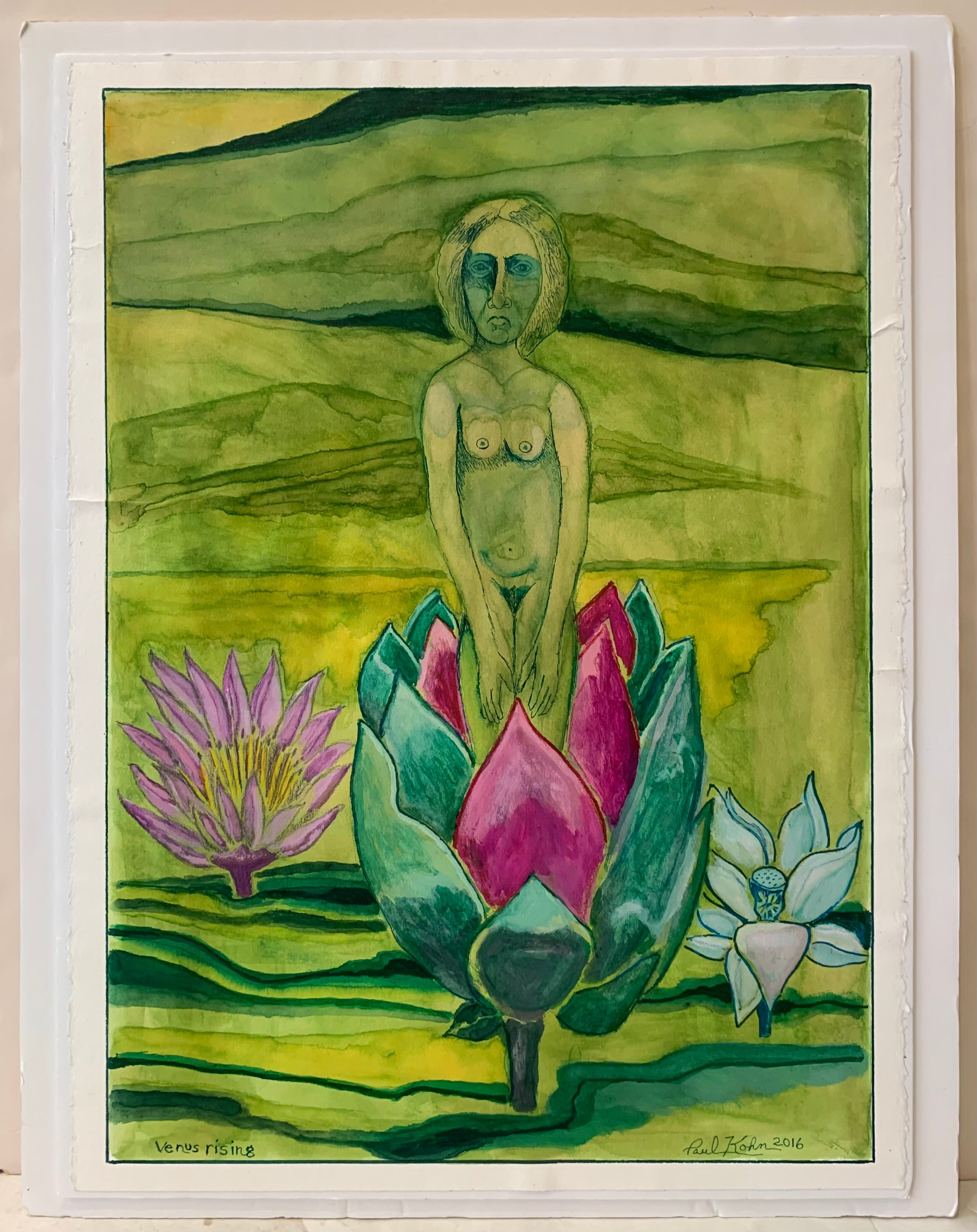 A rendition of "Birth of Venus," a woman emerges from lotus flowers.