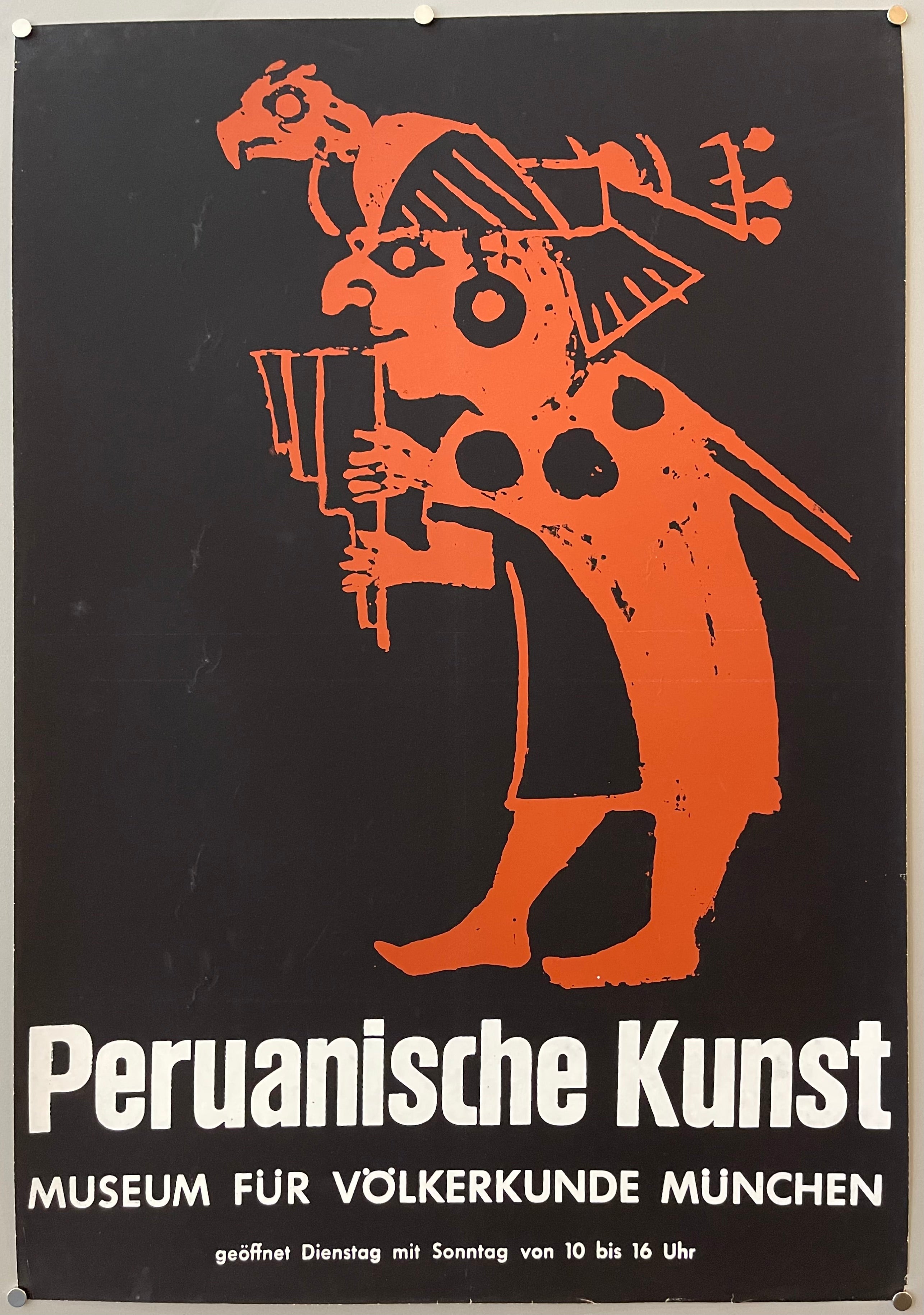 Original vintage poster showing a painting of a man in traditional dress, part of a larger exhibit on Peruvian art in Munich's Folk Art Museum. The painting's unadorned two-dimensional style and orange and black color palette is immediately arresting.