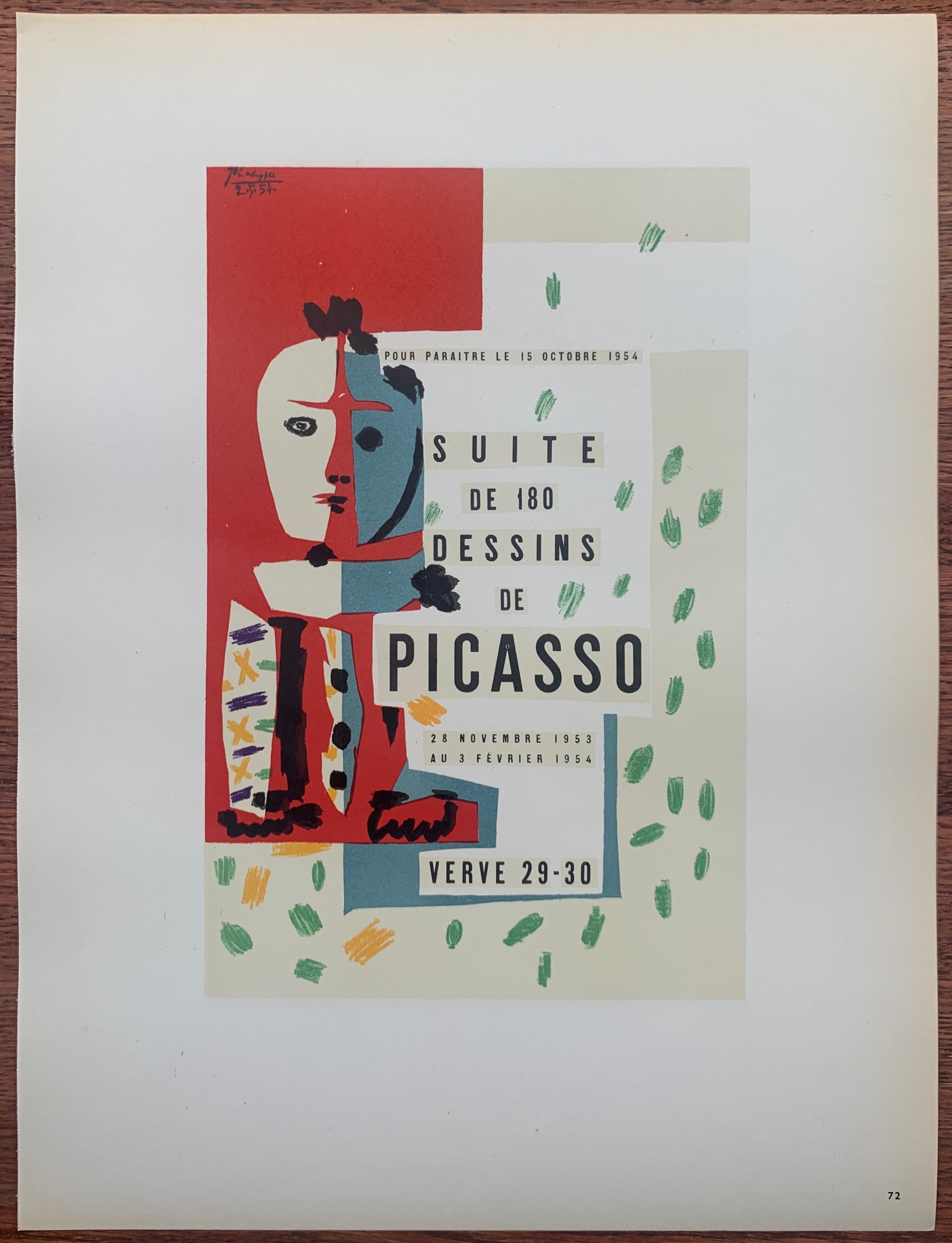 Lithograph designed by Pablo Picasso, advertising an upcoming portfolio of 180 of his drawings to be published by Verve in 1954.