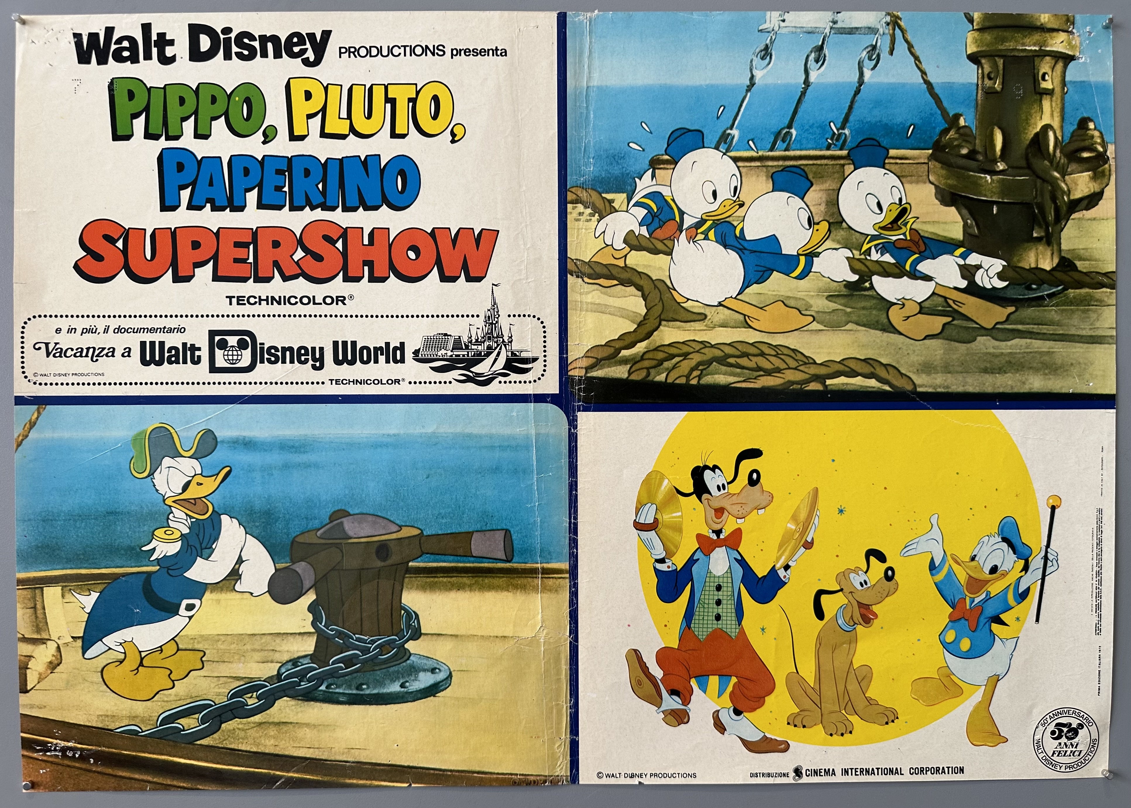 This adorable print shows scenes from the Italian version of the Walt Disney cartoon about Donald Duck, Goofy, and Pluto.