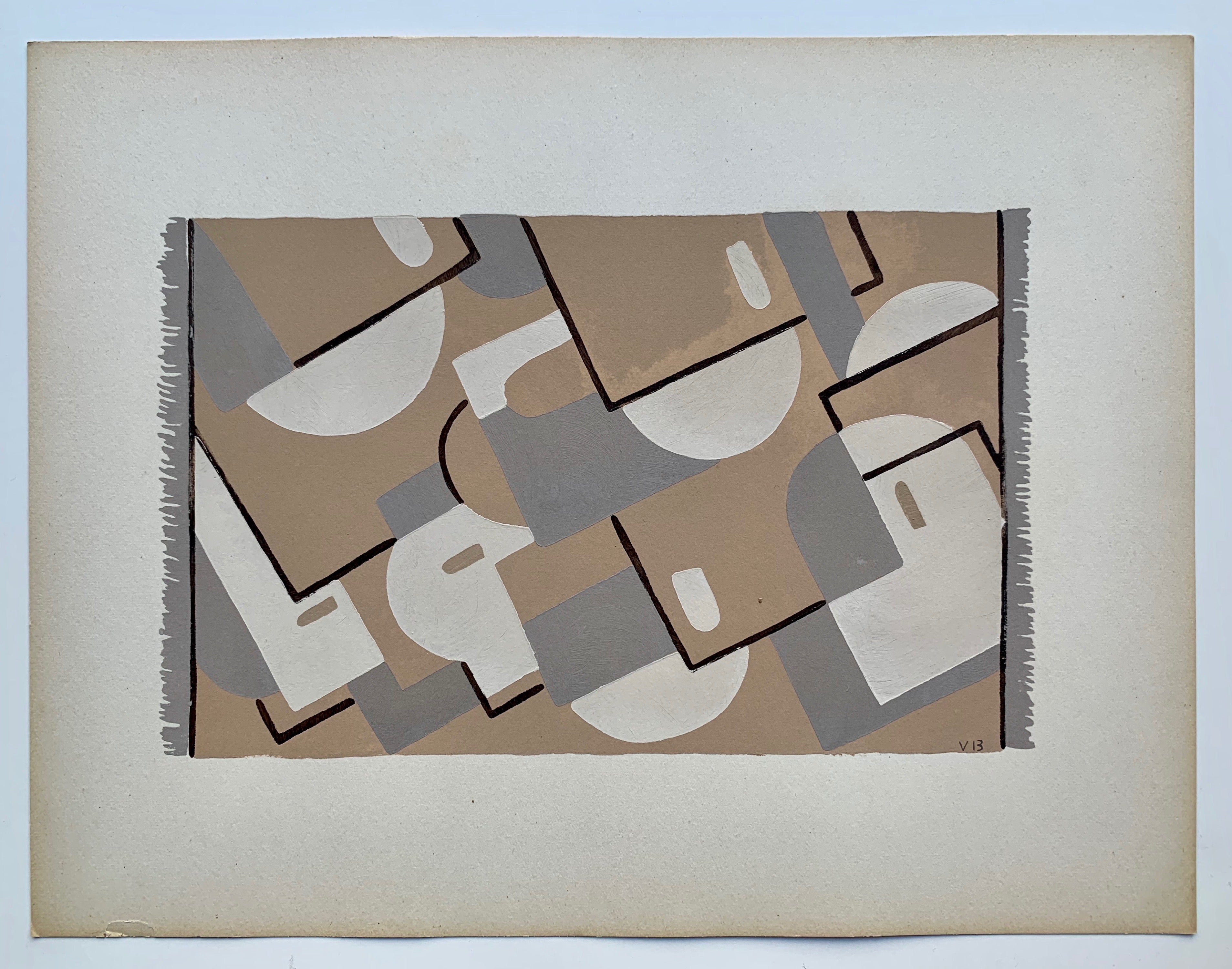 Vladimir Boberman was born in 1897 in the Armenian city Yerevan, which was then part of the Russian Empire. After World War I, Boberman left his native country to start his art career in Paris. There, he exhibited his paintings at the annual Paris Salon. Most notably, Boberman designed abstract carpets for the Decoration Interieure Modern firm (DIM). In 1929, DIM published a collection of his carpets. This stencil displays one of Boberman's designs. In this pochoir series, Boberman uses stencils to produce these refreshingly minimalist and geometric artworks, the bases for what would go on to be printed on his saught-after carpets. This stencil technique of printing originated in the 16th Century to mass produce playing cards. After centuries of usage, however, stenciling fell out of fashion in the 30s because of high labour costs, making this Boberman pochoir series one of the latest examples of the technique while it was still common practice.