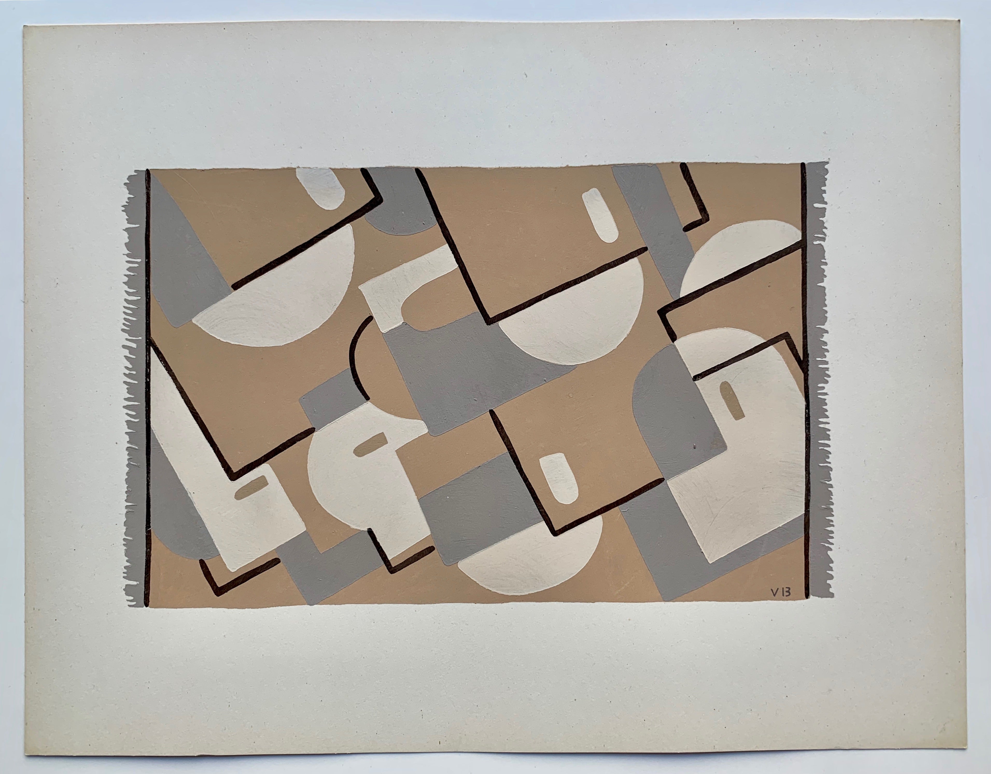 Vladimir Boberman was born in 1897 in the Armenian city Yerevan, which was then part of the Russian Empire. After World War I, Boberman left his native country to start his art career in Paris. There, he exhibited his paintings at the annual Paris Salon. Most notably, Boberman designed abstract carpets for the Decoration Interieure Modern firm (DIM). In 1929, DIM published a collection of his carpets. This stencil displays one of Boberman's designs. In this pochoir series, Boberman uses stencils to produce these refreshingly minimalist and geometric artworks, the bases for what would go on to be printed on his saught-after carpets. This stencil technique of printing originated in the 16th Century to mass produce playing cards. After centuries of usage, however, stenciling fell out of fashion in the 30s because of high labour costs, making this Boberman pochoir series one of the latest examples of the technique while it was still common practice.