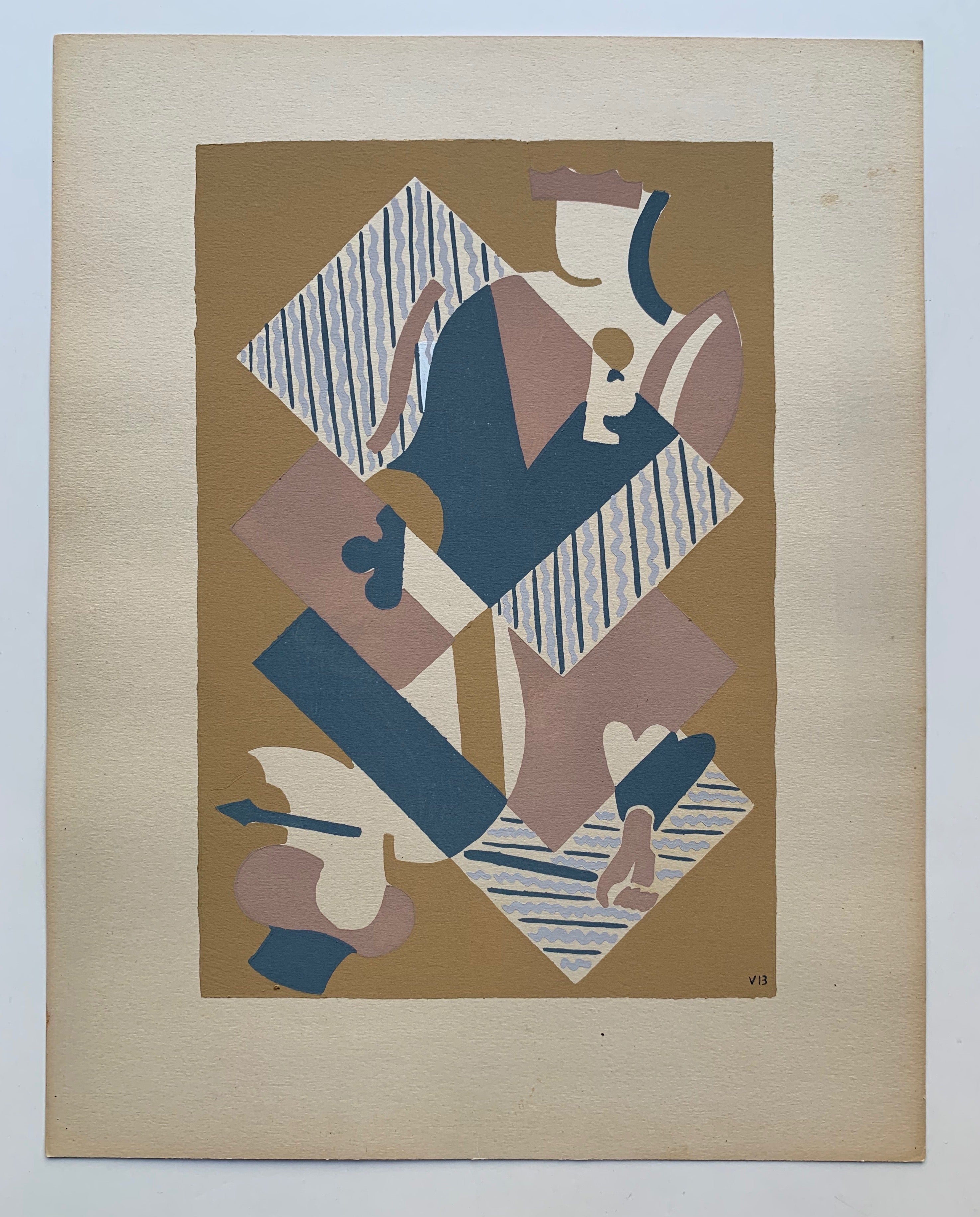 Vladimir Boberman was born in 1897 in the Armenian city Yerevan, which was then part of the Russian Empire. After World War I, Boberman left his native country to start his art career in Paris. There, he exhibited his paintings at the annual Paris Salon. Most notably, Boberman designed abstract carpets for the Decoration Interieure Modern firm (DIM). In 1929, DIM published a collection of his carpets. This stencil displays one of Boberman's designs. In this pochoir series, Boberman uses stencils to produce these refreshingly minimalist and geometric artworks, the bases for what would go on to be printed on his saught-after carpets. This stencil technique of printing originated in the 16th Century to mass produce playing cards. After centuries of usage, however, stenciling fell out of fashion in the 30s because of high labour costs, making this Boberman pochoir series one of the latest examples of the technique while it was still common practice.