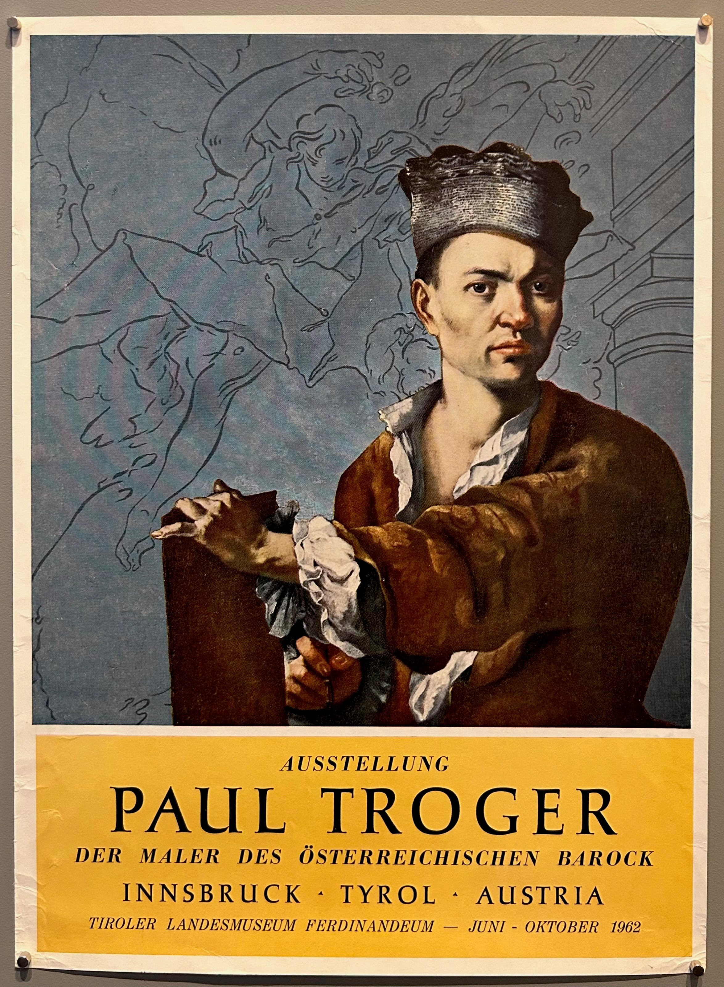 Paul Troger was an Austrian painter, draughtsman, and printmaker of the late Baroque period. This poster promotes an exhibition of his at the Tyrolean State Museum.