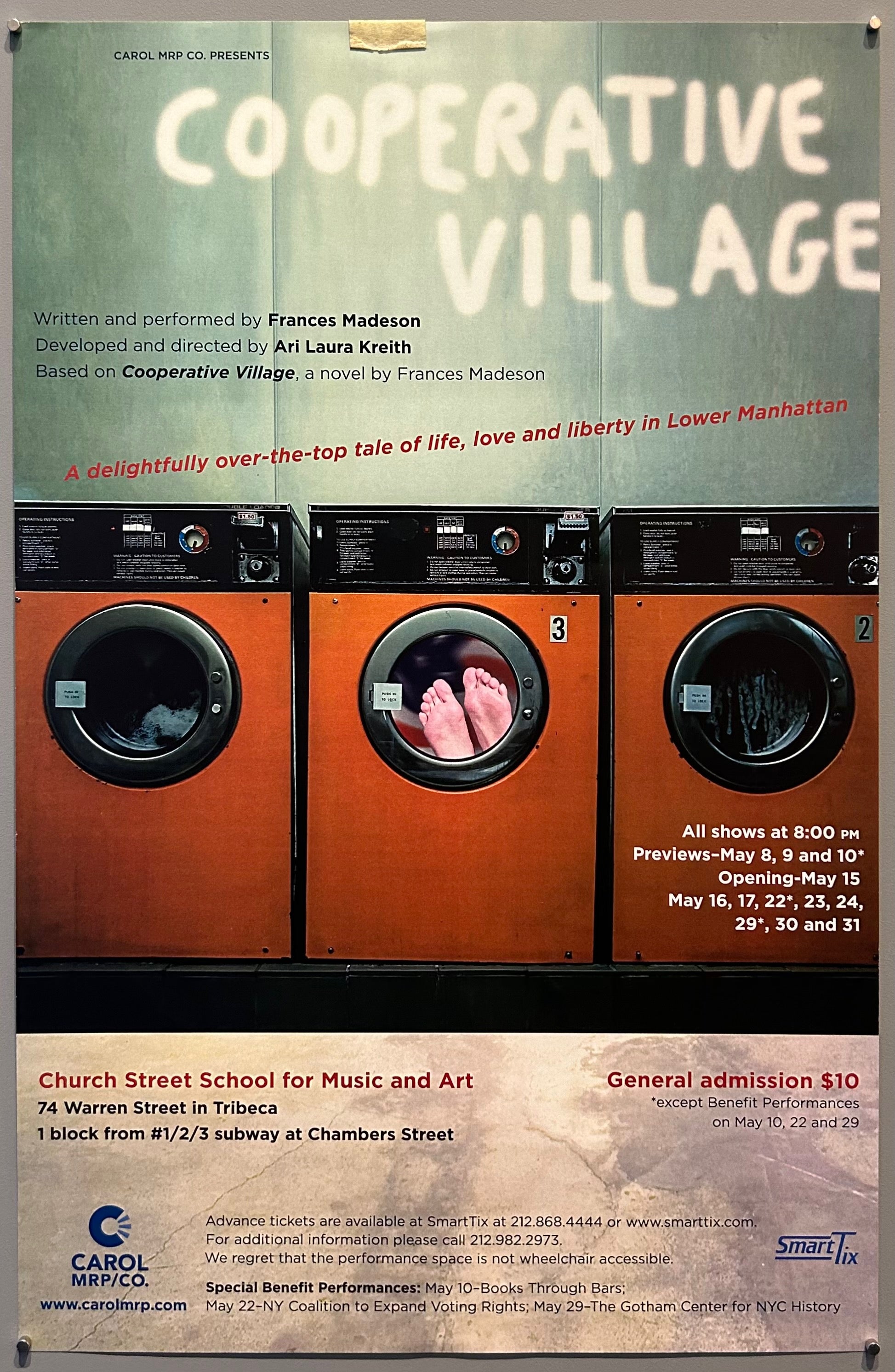 "Carol MRP Co. Presents Cooperative Village / Written and performed by Frances Madeson / Developed and directed by Ari Laura Kreith / Based on Cooperative Village, a novel by Frances Madeson / A delightfully over-the-top tale of life, love and liberty in Lower Manhattan"