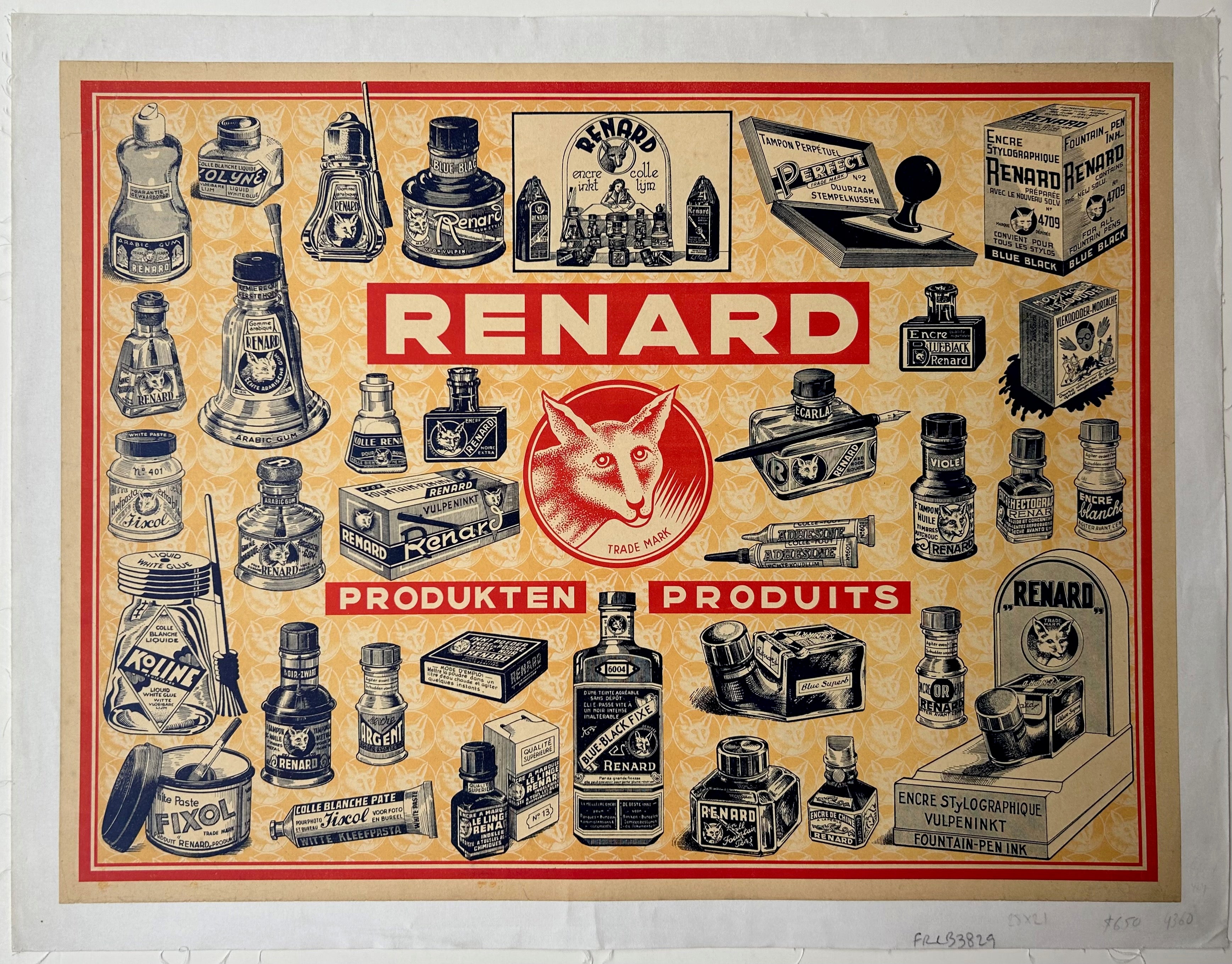 Original vintage poster advertising Renard's goods. The poster features blue illustrations of various of their offerings, almost like a large catalogue.