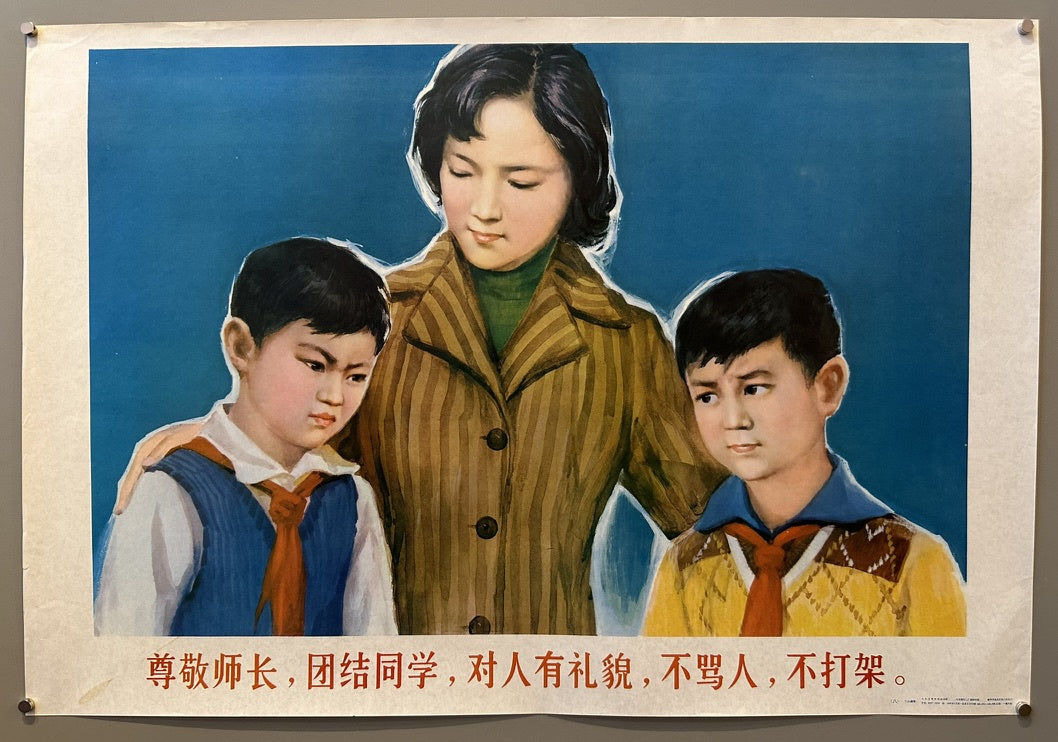 Two young boys and a teacher with her hands on their shoulders. The boys look distraught, as if they were fighting with one another, but the teacher's presence is calming and helpful. "Respect teachers, unite classmates, be polite to others, do not curse or fight."
