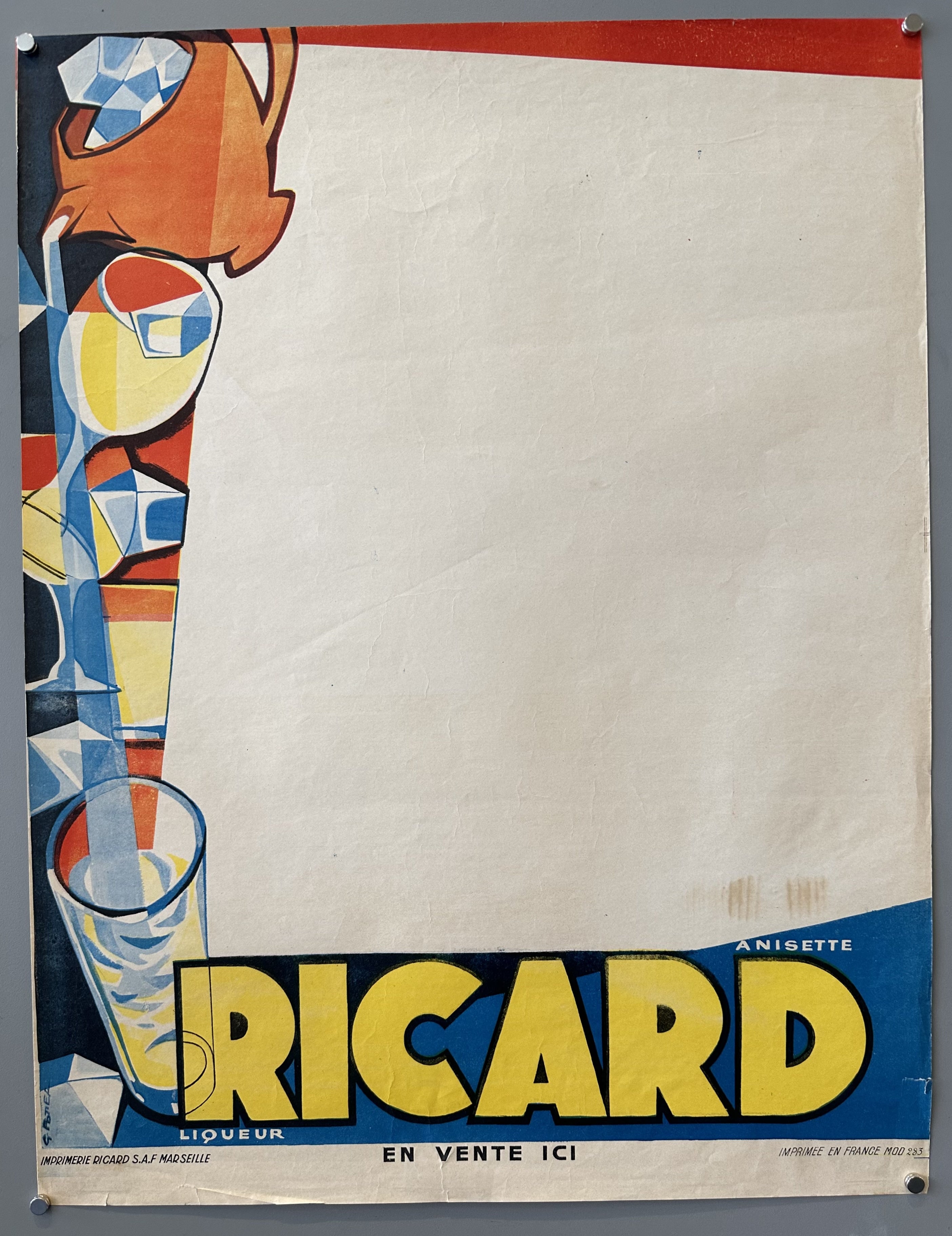 Vintage French poster advertising Ricard, a pastis liqueur. Mid-century modern images of drinks and ice line the sides. Blank space would be available for restaurants and bars to put their own menu on.
