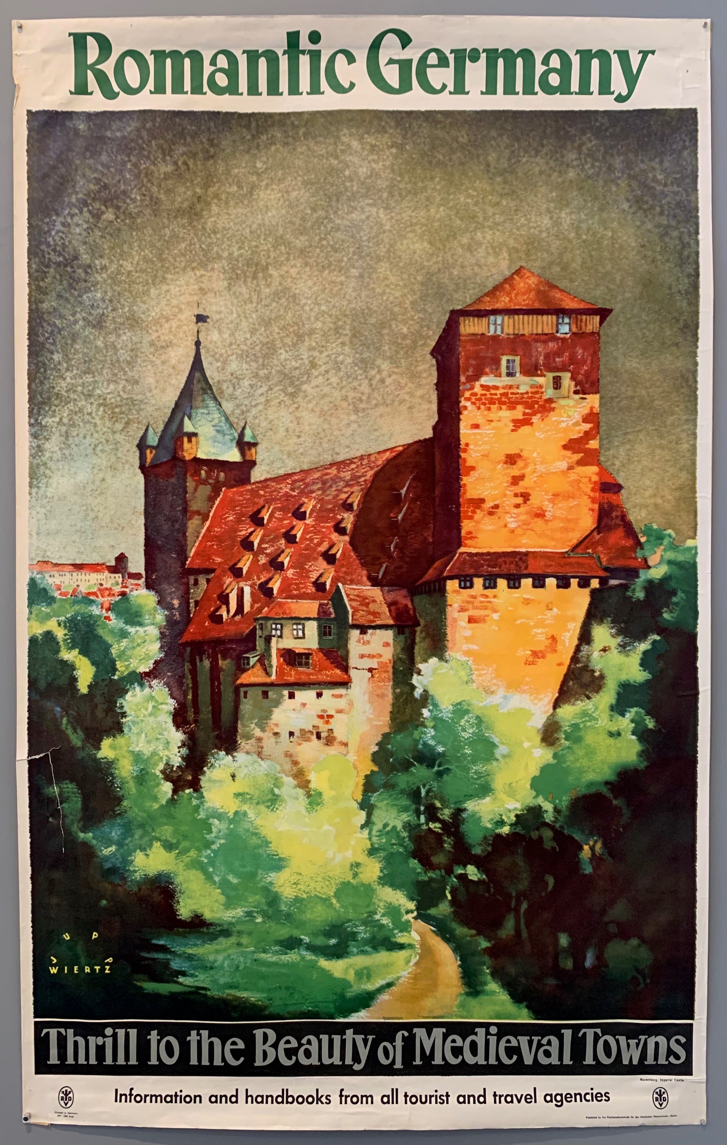 Beautiful view of a medieval castle in Germany surrounded by lush greenery. Made by artist Jupp Wiertz, who studied in Berlin, and worked on publicity for the German Reichsbahn and the Zeppelin production art designs and for Lufthansa.