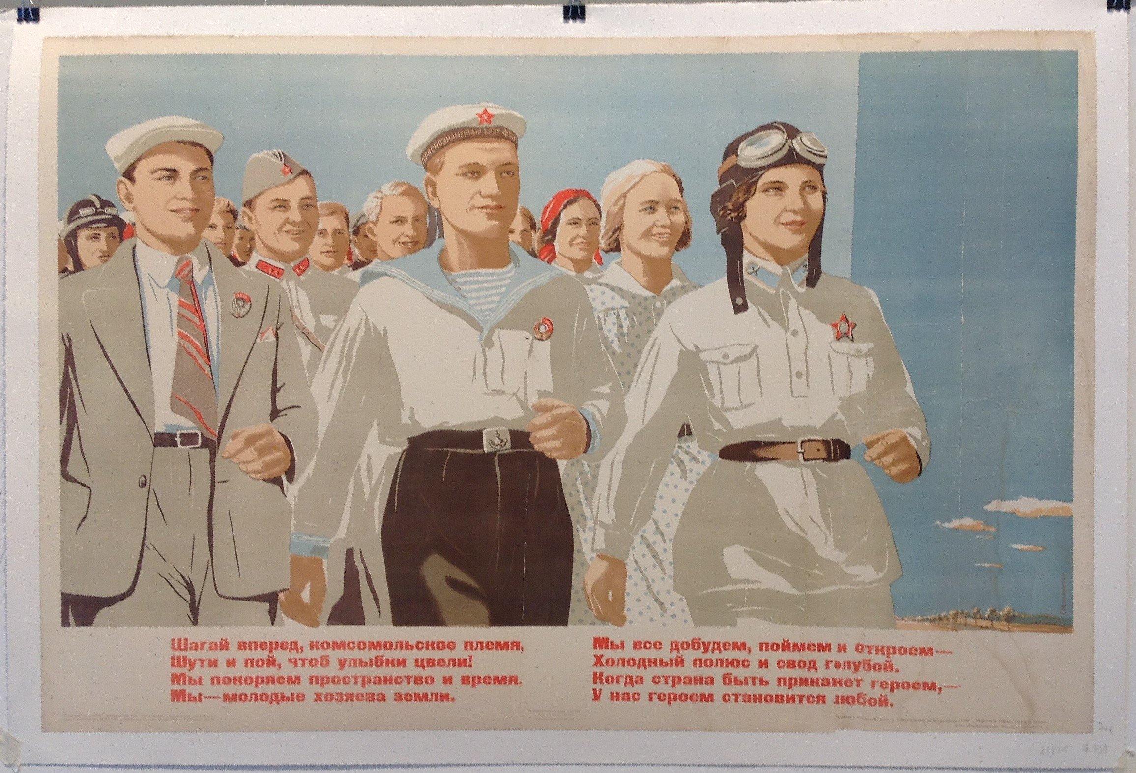 Translated Text: March forward, Komsomol generation Joke and sing so that a smile will bloom! "We overcome space and time," We – who are the young owners of the earth. "We will obtain, understand and discover everything –" The cold Pole and the blue arch of heaven. "When the country orders you to become heroes," Every one among us will become a hero. (On the sailor’s cap) Red Flag Baltic Fleet