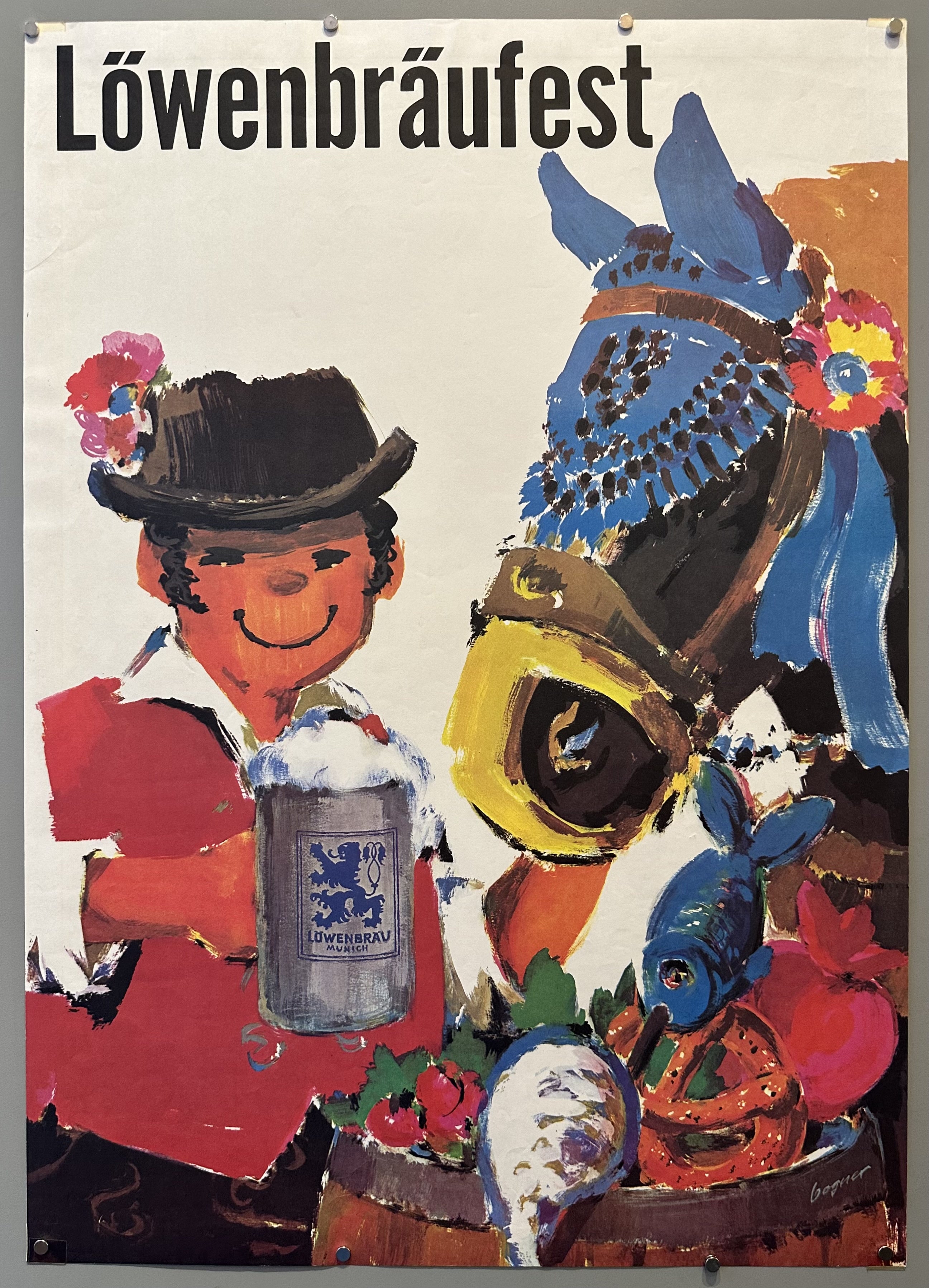 A colorful and whimsical poster from Löwenbrau beer promoting Oktoberfest in Munich.