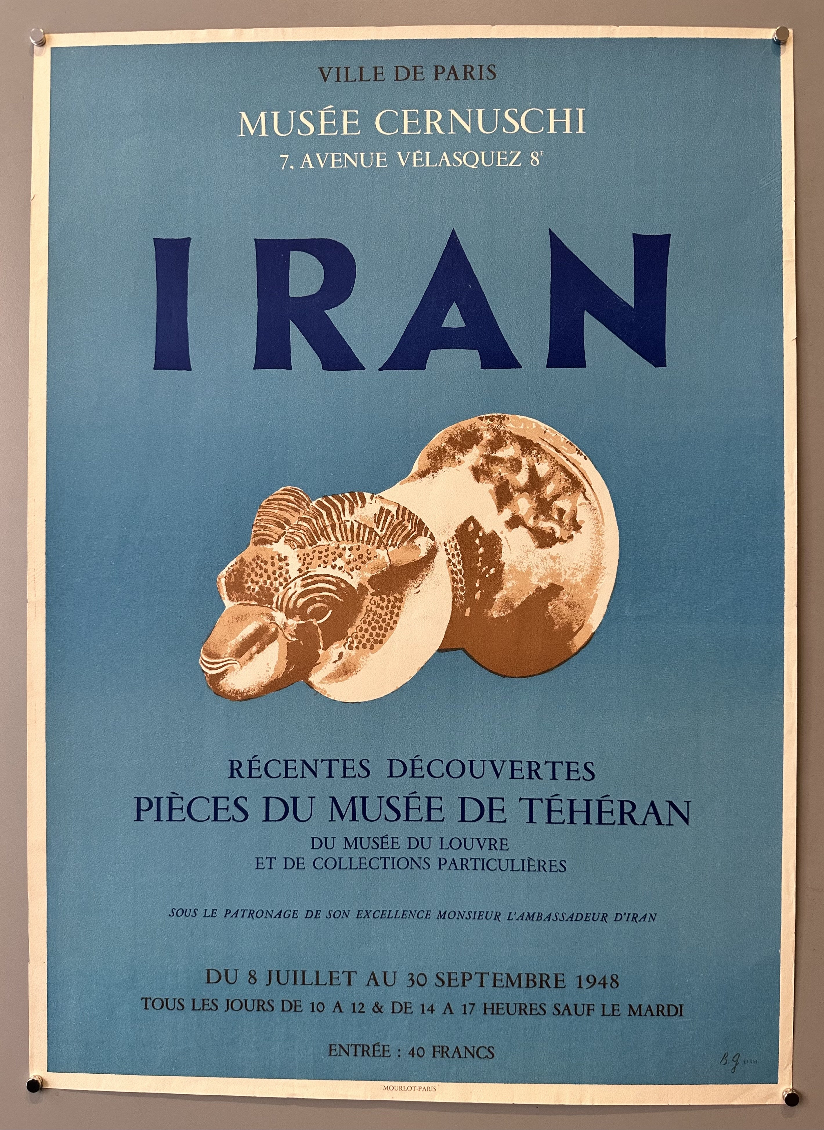 English translation: "City of Paris / Cernuschi Museum / 7. Avenue Vélasquez 8e / IRAN / Recent Discoveries / Pieces from the Tehran Museum, the Louvre Museum and Private Collections / Under the Patronage of His Excellency the Iranian Ambassador / from July 9 to September 30, 1948 / Every Day from 10 a.m. to 12 p.m. & from 2 p.m. to 5 p.m. Except Tuesday"