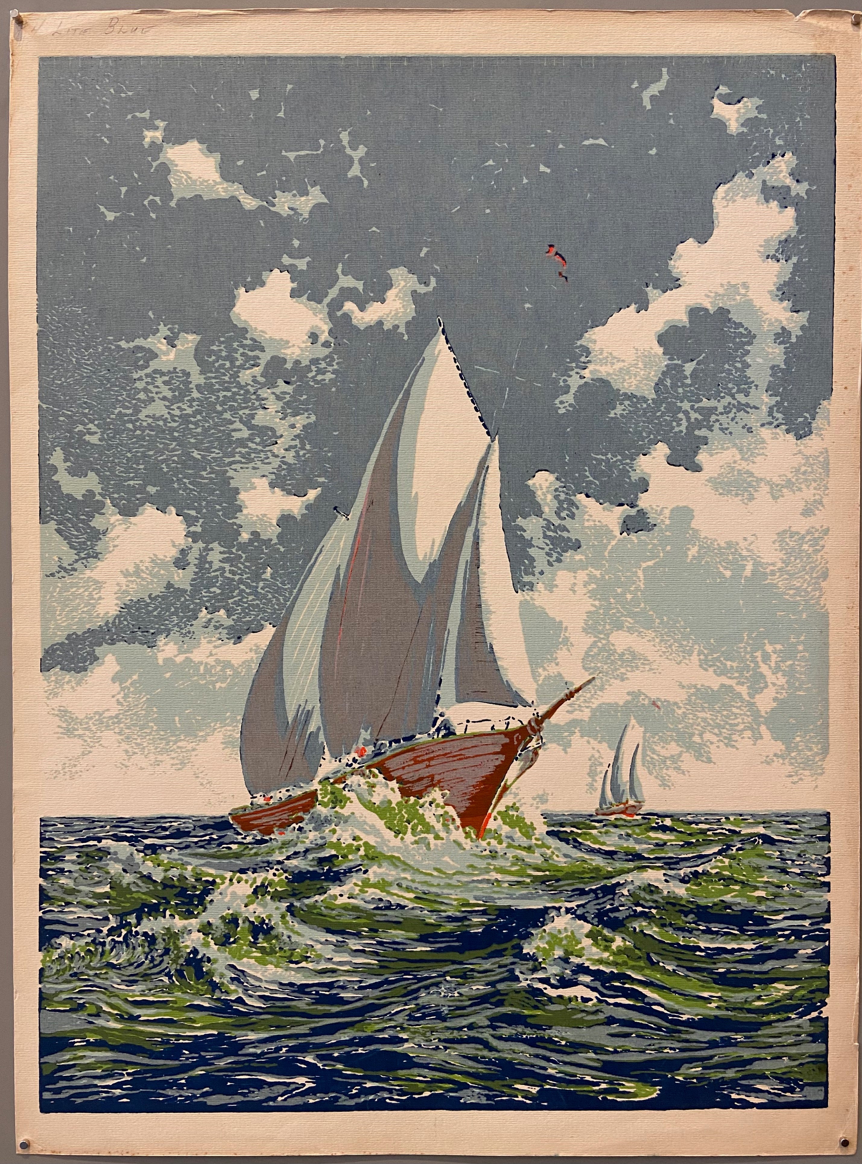 Original vintage silkscreen showing a glorious sailboat crashing through blue and green-tipped waves. This print is an early state of the finished poster design, which we also offer at our store. With this version of the print, the artist was still experimenting with how he would color the sky, the result of which was a lovely muted effect on this print here.