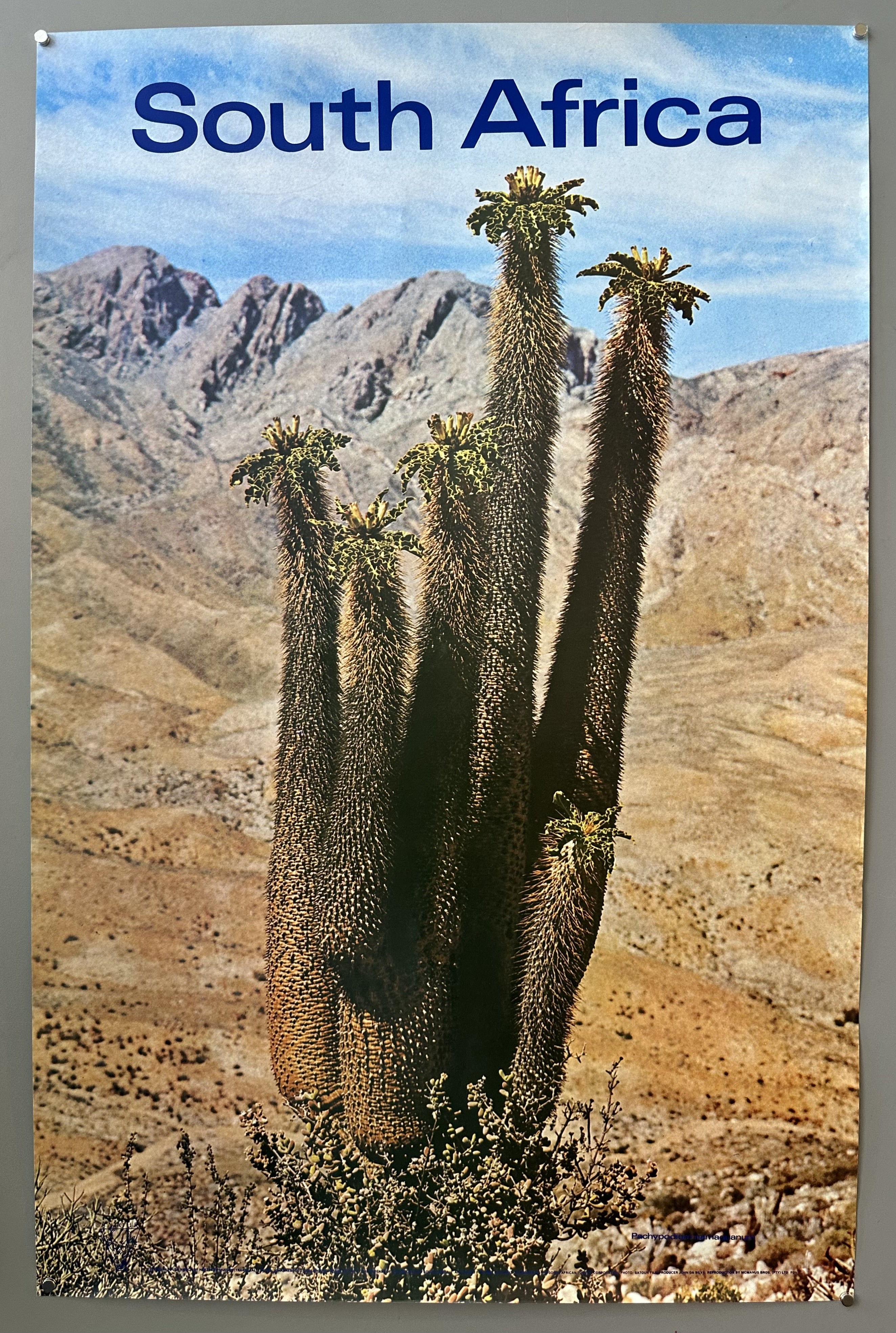 Advertising South Africa with a large cactus in the foreground and mountains in the background.