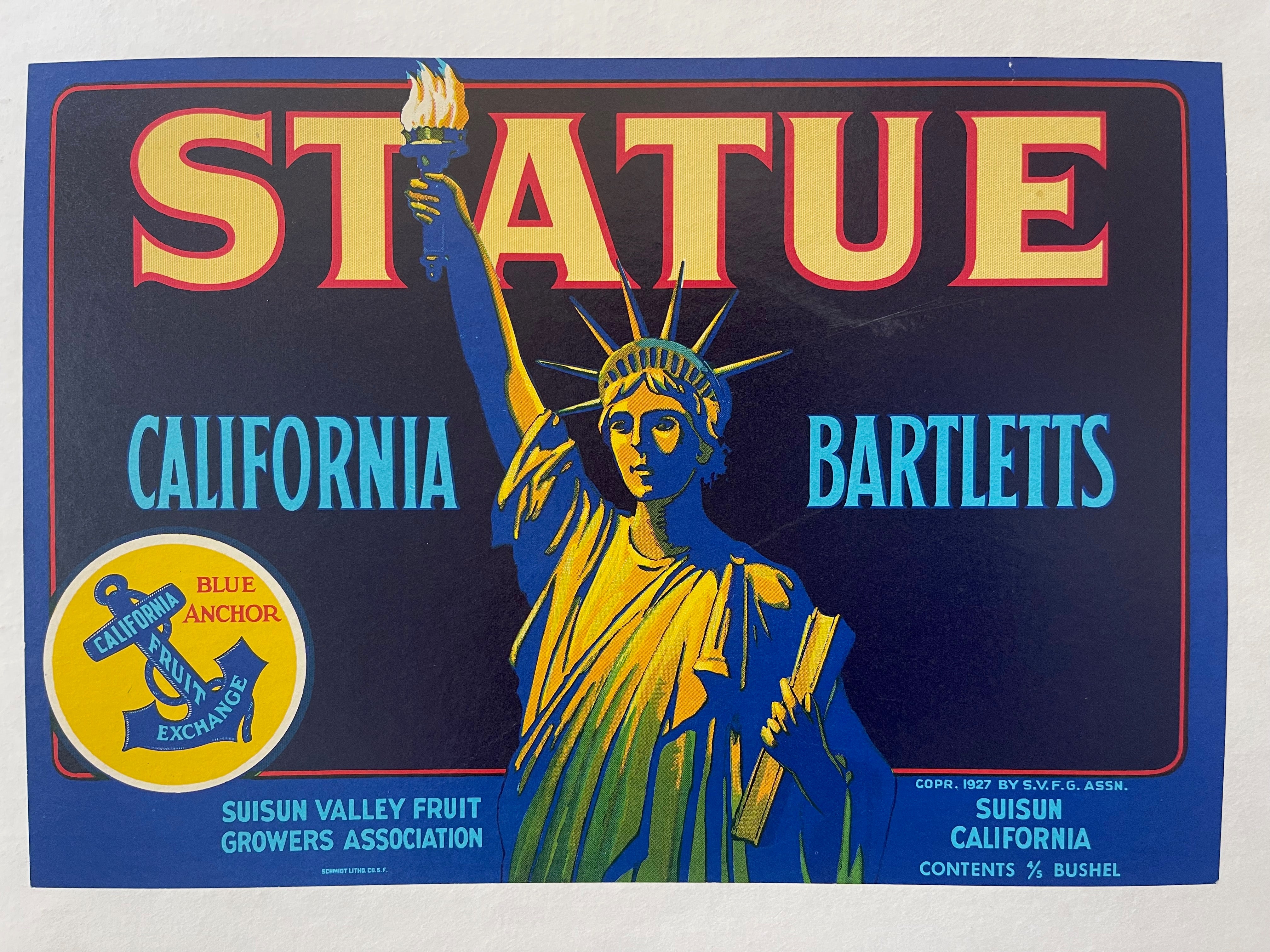 Illuminated by the light of her torch, lady liberty stands proudly upon this label for California Barlett pears.