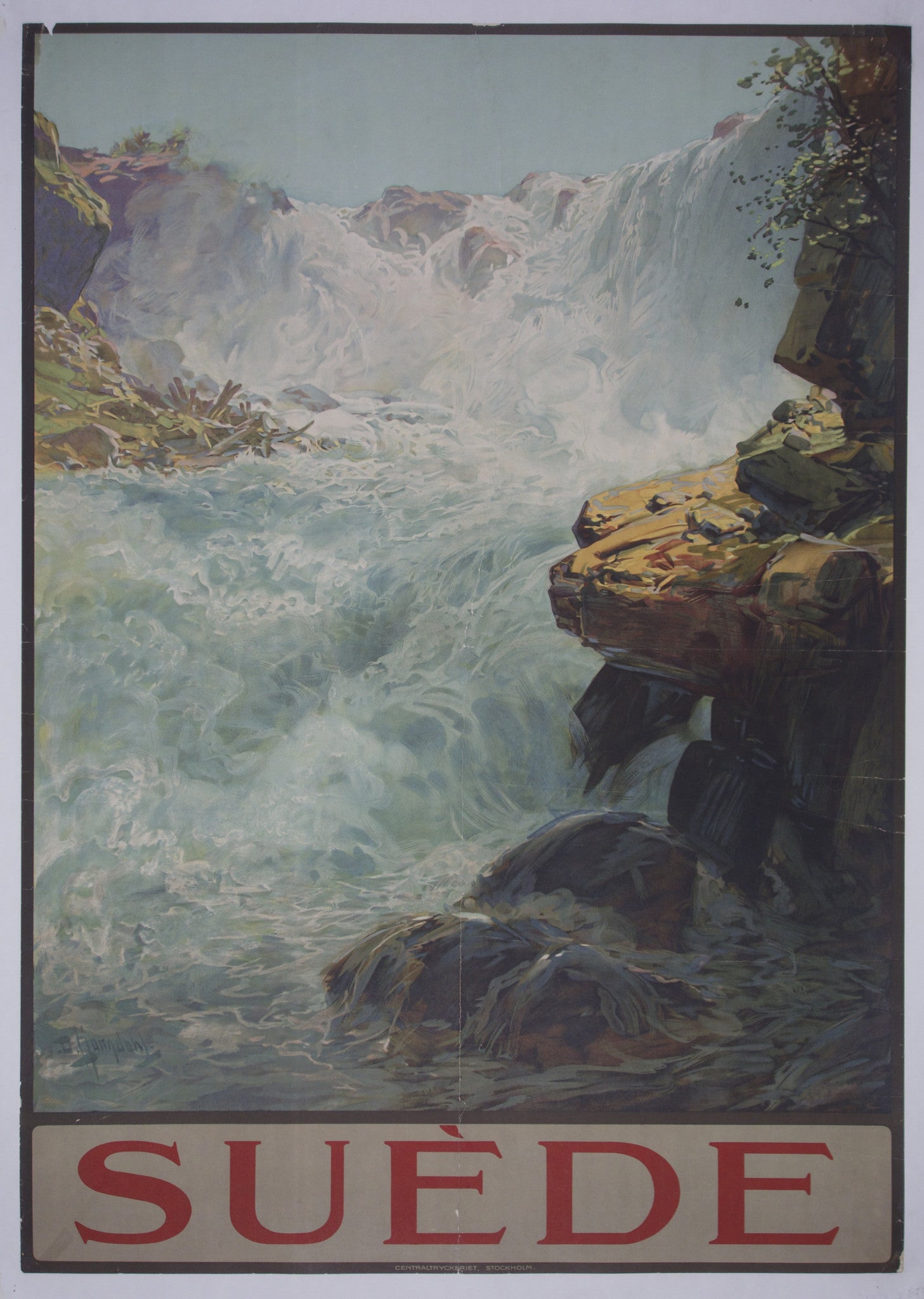 Vintage Swedish poster illustrating the natural and terrifying beauty of a waterfall and rapids.