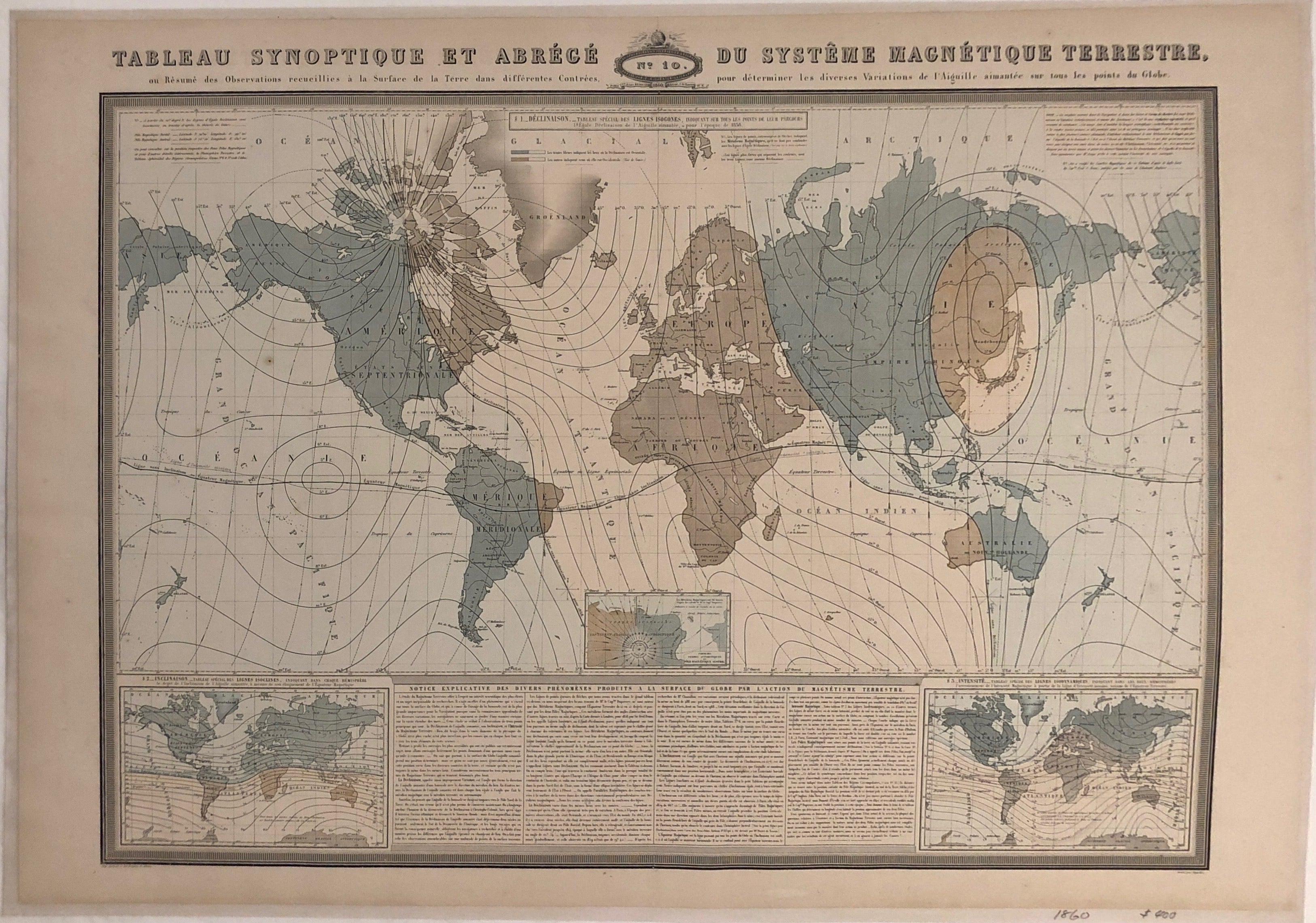 This vintage map from the 19th Century is a wonderful testament to the scientific knowledge and exploration of that era. The map outlines the magnetic fields of Earth at a time when magnetism was still an emerging field in physics.