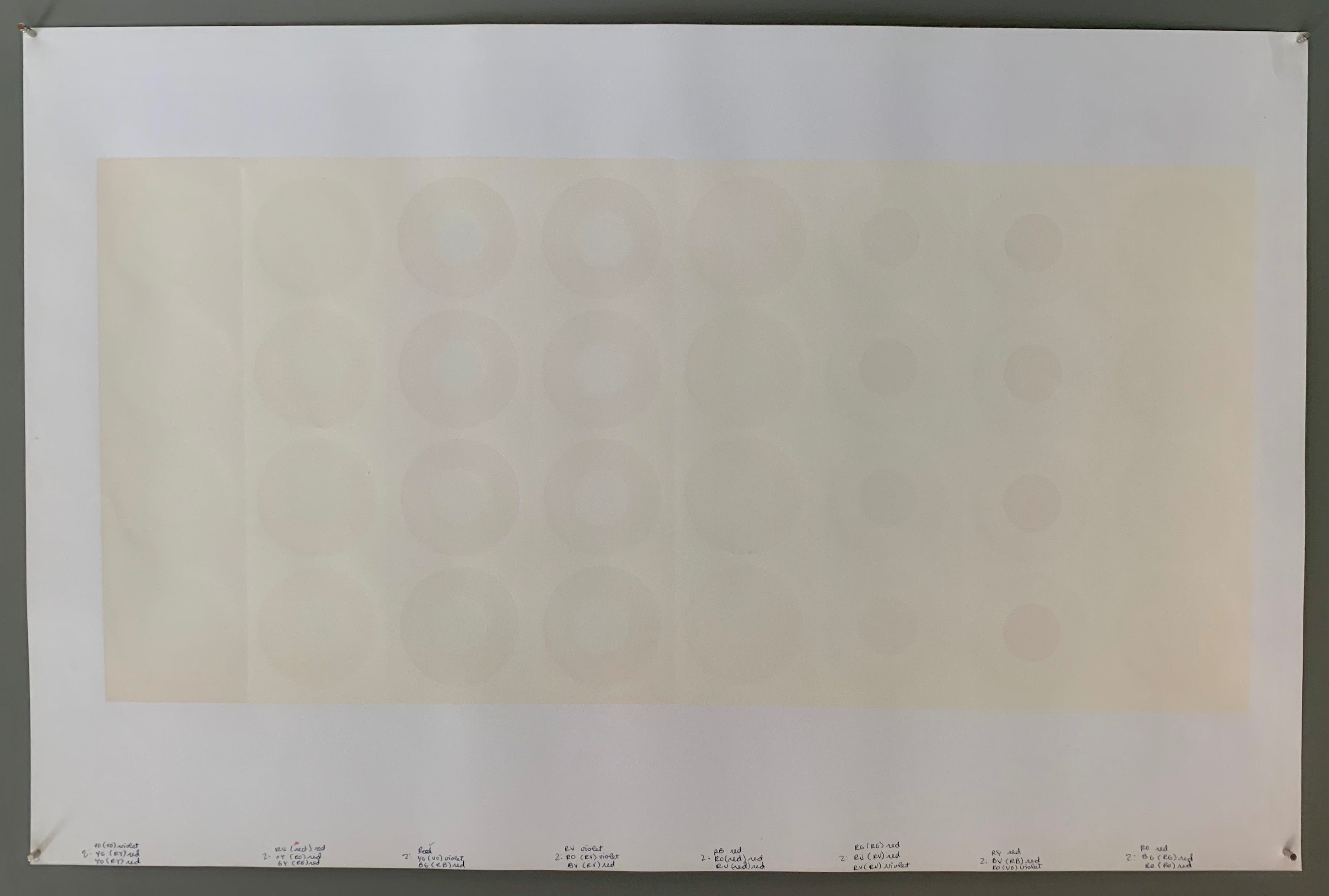 Original silkscreen print by artist Peter Gee showing a rectangle made by eight panels each holding a line of targets. The targets are hued in the lightest of pastels, hints of yellow, blue, green, and pink, creating a lovely combination.