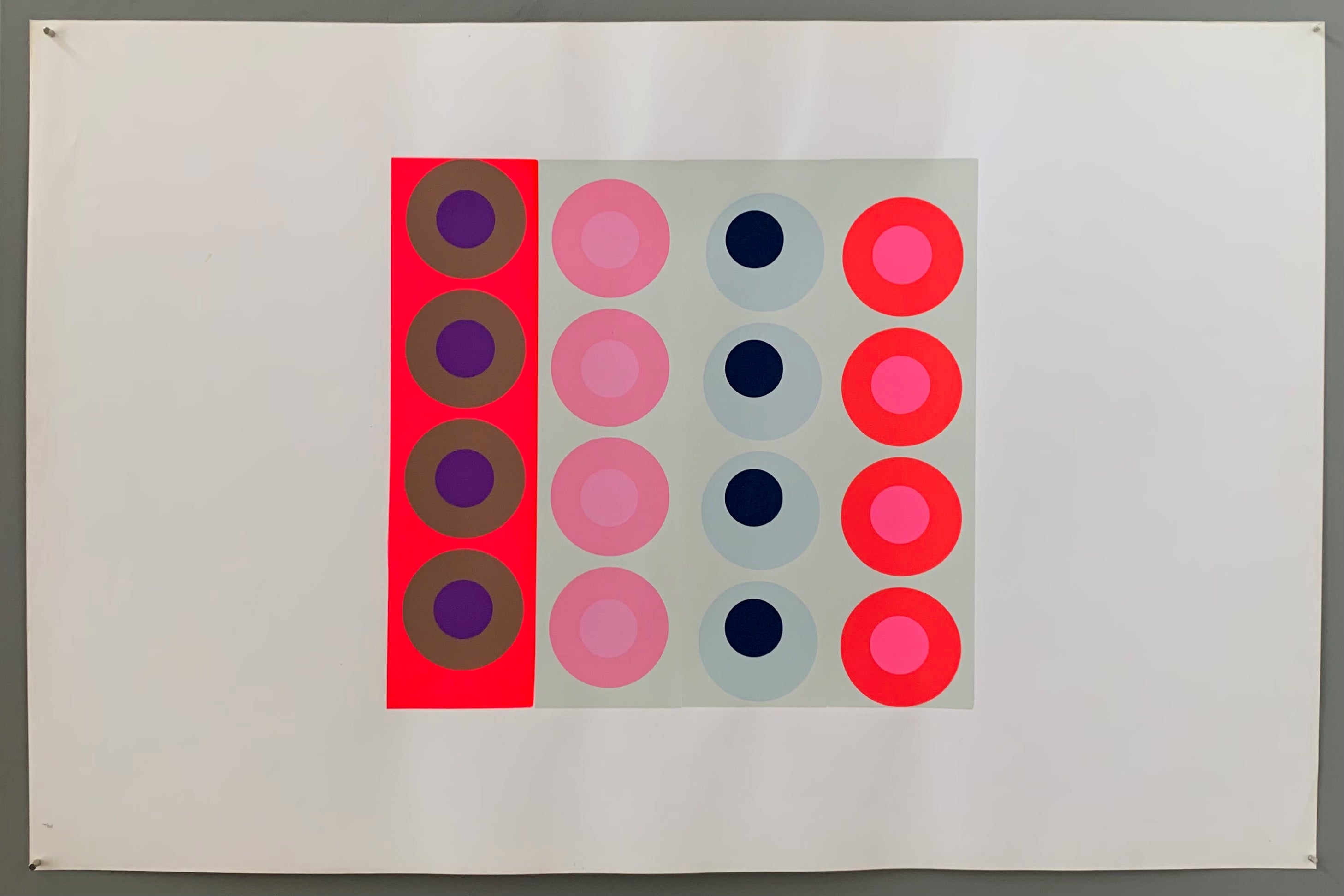 Original silkscreen print by artist Peter Gee showing four panels of multicolored targets. The bold colors include neon pink, creamy pink, grey, black, purple, and brown, colors that wouldn't necessarily go together, but work well here, the entire geist of pop art. Some of the "bullseyes" are slightly off-center, giving this print an extra layer of complexity.