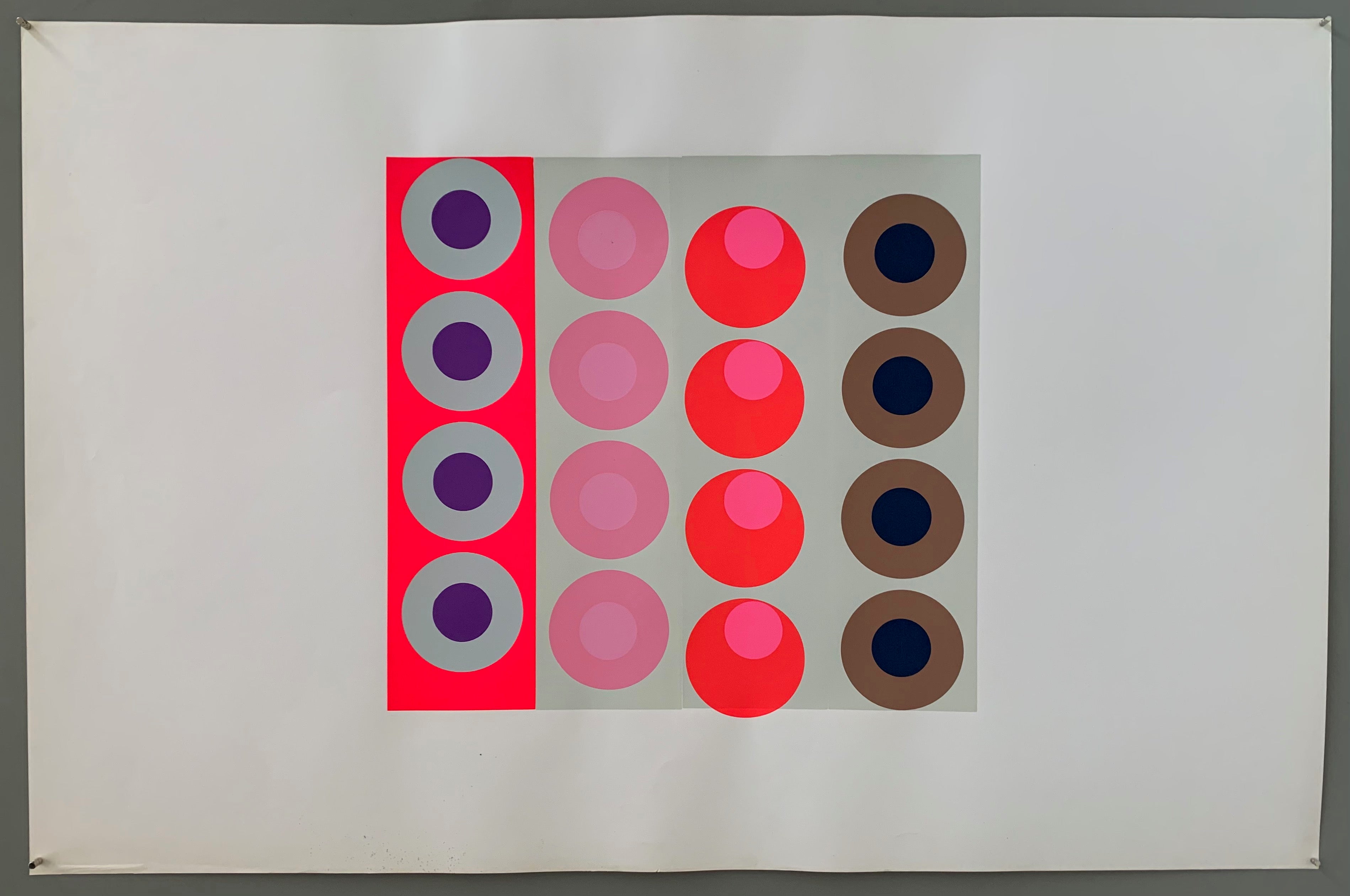 Original silkscreen print by artist Peter Gee showing four panels of multicolored targets. The bold colors include neon pink, creamy pink, grey, black, purple, and brown, colors that wouldn't necessarily go together, but work well here, the entire geist of pop art. Some of the targets are falling out of their panel, giving this print an extra layer of complexity and movement.