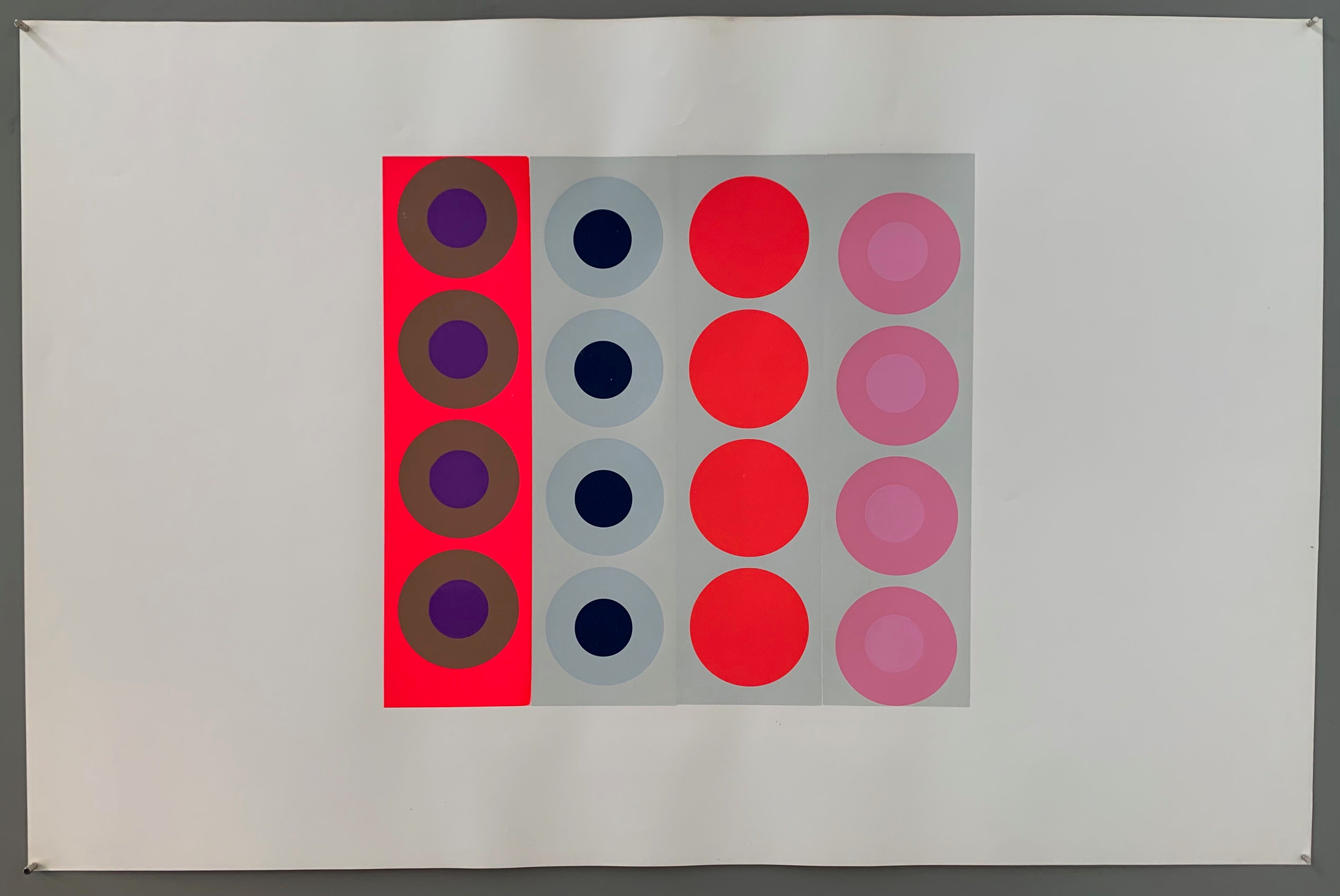 Original silkscreen print by artist Peter Gee showing four panels of multicolored targets. The bold colors include neon pink, creamy pink, grey, black, purple, and brown, colors that wouldn't necessarily go together, but work well here, the entire geist of pop art.