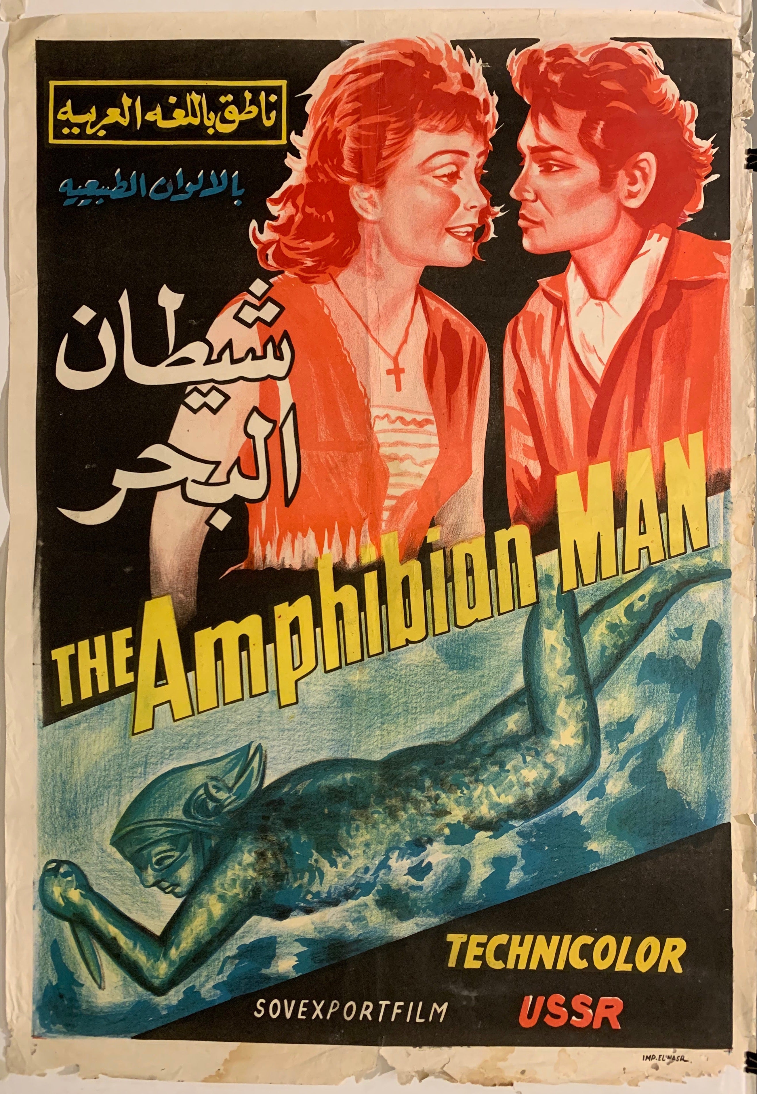 Vintage movie poster for the Arabic release of the Soviet film The Amphibian Man, a love story between a beautiful young woman and a handsome "sea devil."