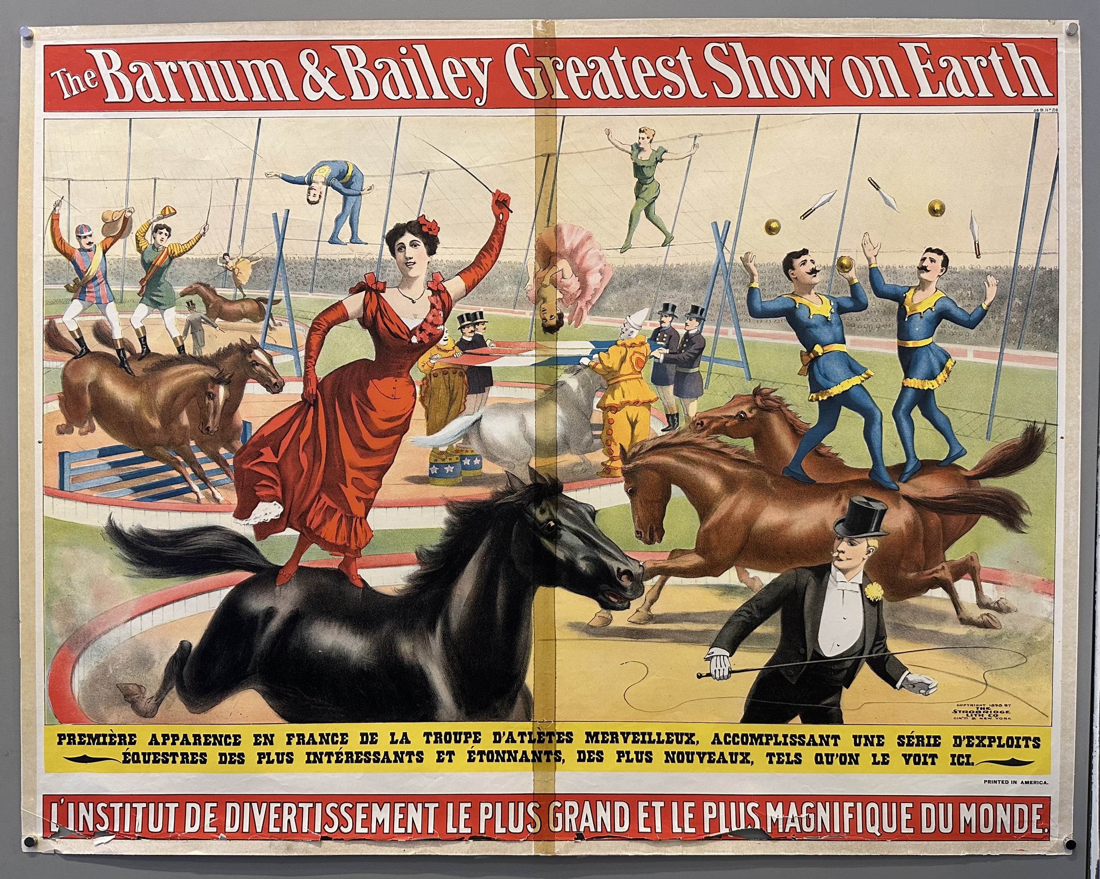 English translation: "FIRST APPEARANCE IN FRANCE OF THE TROUPE OF MARVELOUS ATHLETES, ACCOMPLISHING A SERIES OF THE MOST INTERESTING AND ASTONISHING EQUESTRIAN EXPLOITS, OF THE MOST NEW, AS SEEN ICL. The largest and most Magnificent Entertainment Institute in the world."