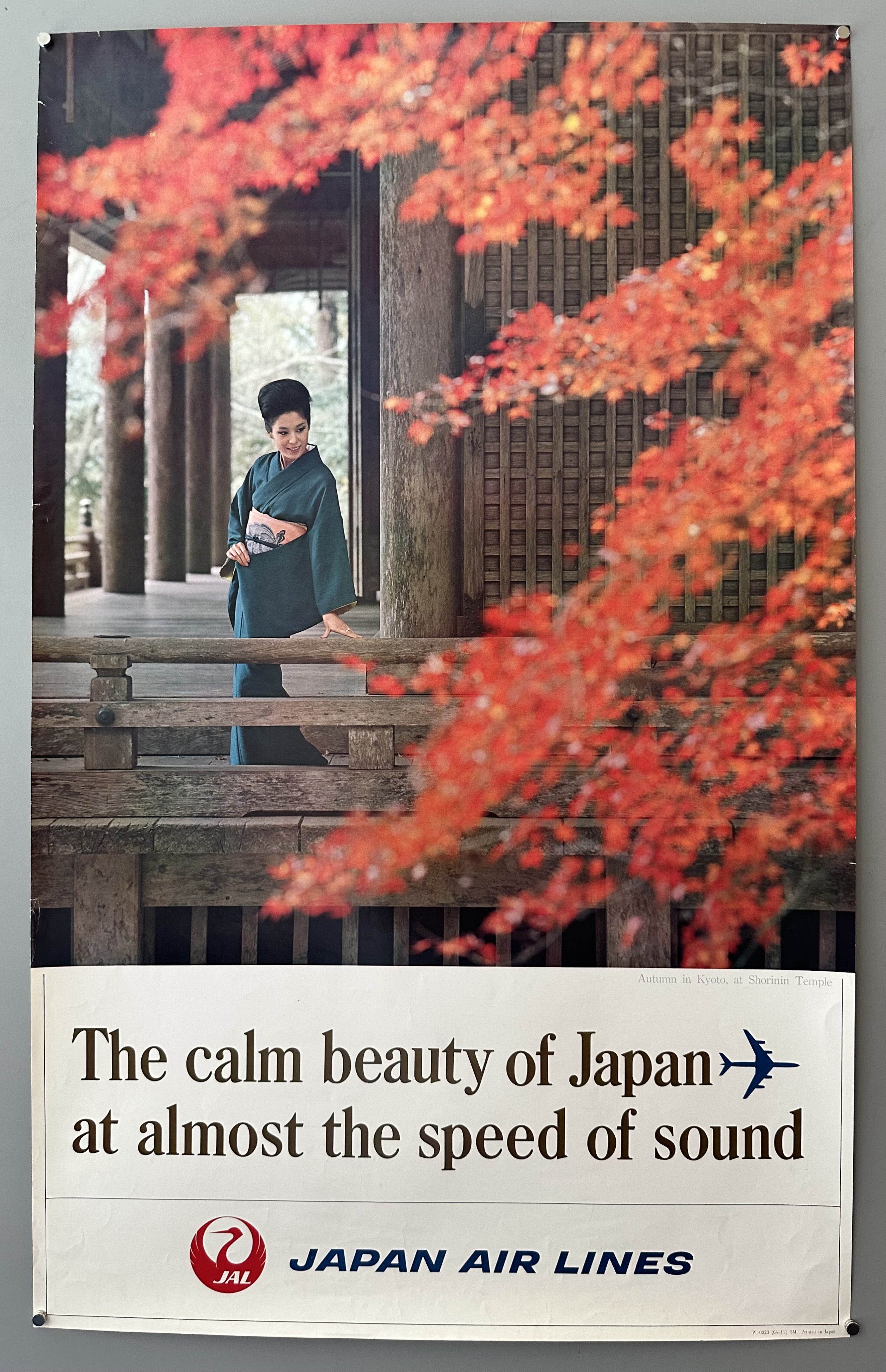 Published by Japan Air Lines, this print shows autumn in Kyoto, with a woman in a kimono peering of Shorinin Temple, framed by lush fall foliage.