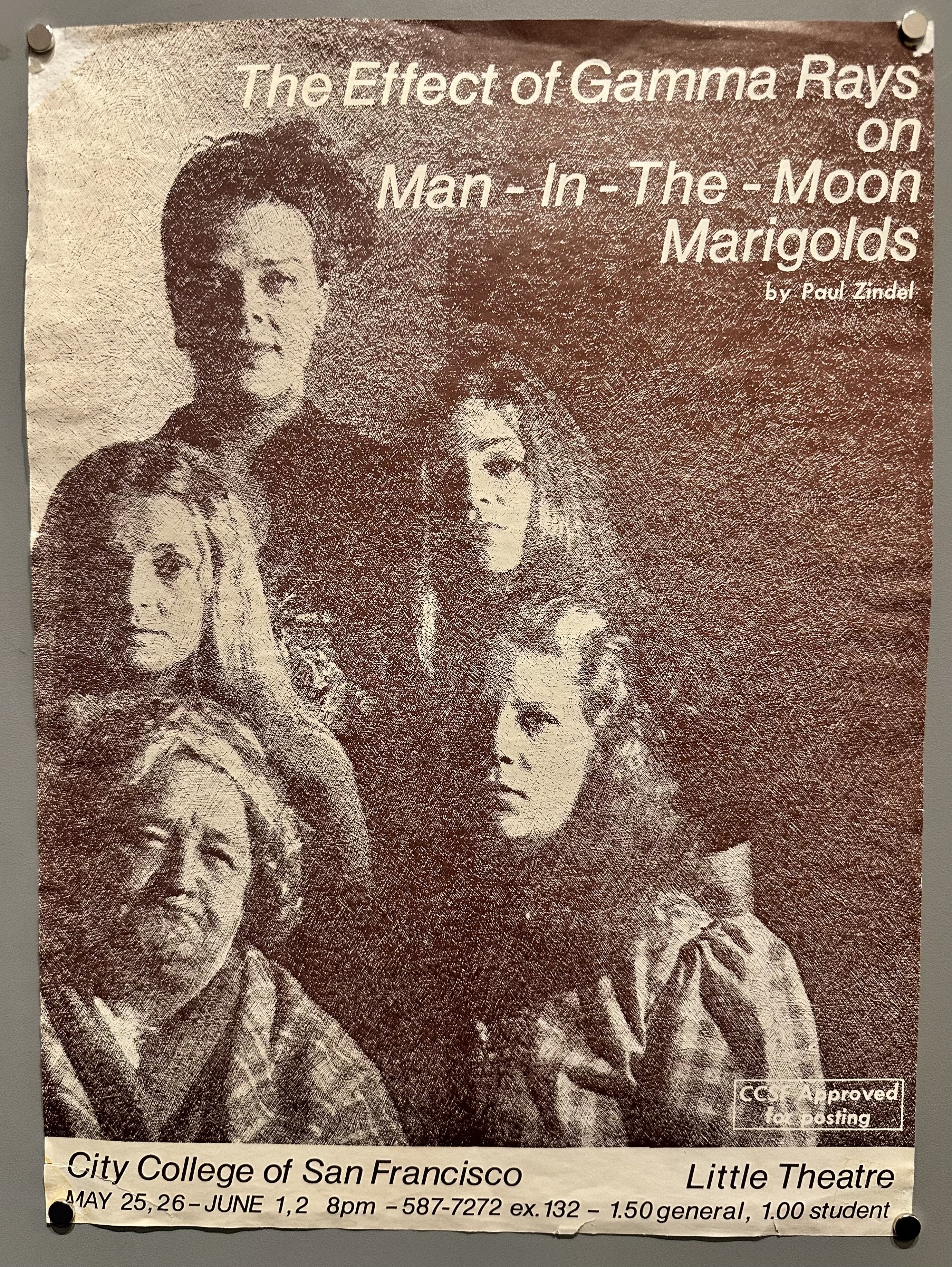 Promotional poster for a City College of San Francisco stage production of the Pulitzer Prize-winning play by Paul Zindel. The play was also adapted into a film in 1972 directed by Paul Newman.