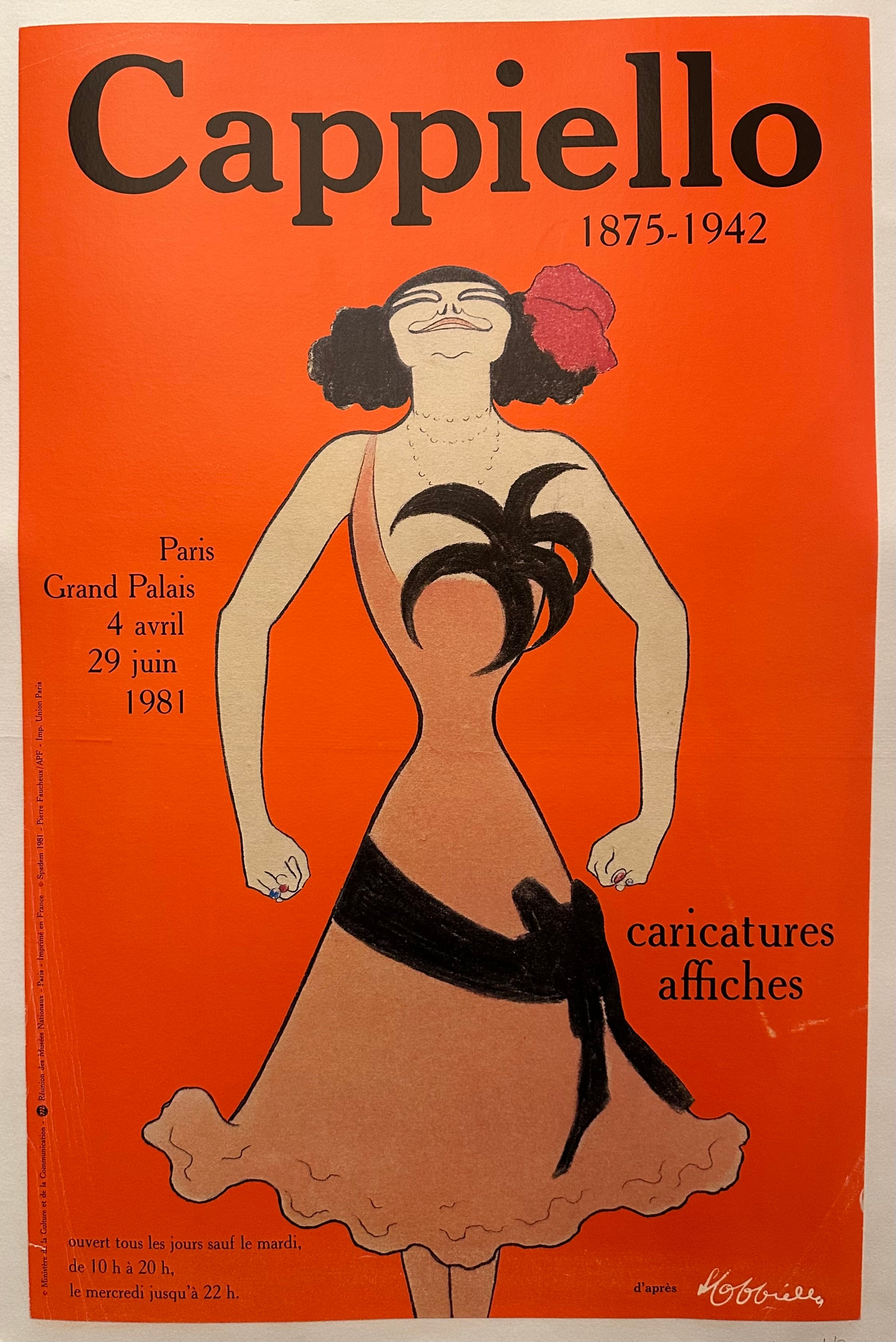This eye-catching poster advertises a collection of "caricatures affiches" or "cartoon posters" by the French designer Leonetto Cappiello at the Grand Palais museum in Paris, France. Beginning April 4th, 1981, the poster - featuring one of Cappiello's many stunning works - invites museum patrons to immerse themselves in a gallery of color, creativity, and grandeur.