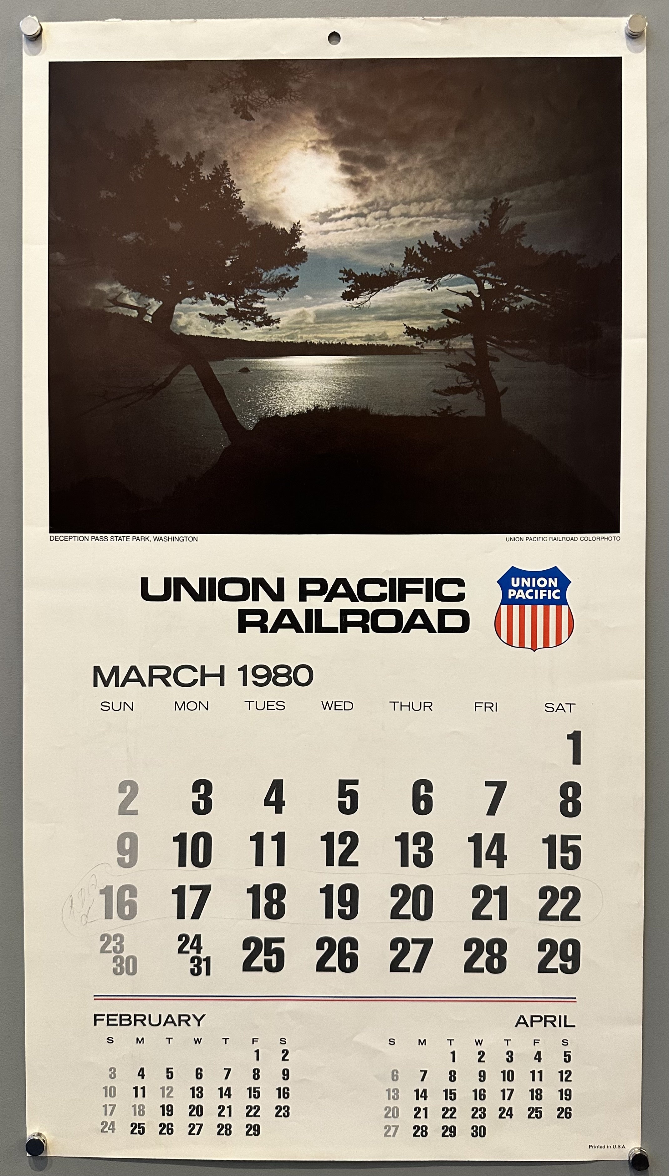 A double-sided calendar from Union Pacific Railroad with a photograph of a train in Green River, Wyoming, on the back for the month of October.