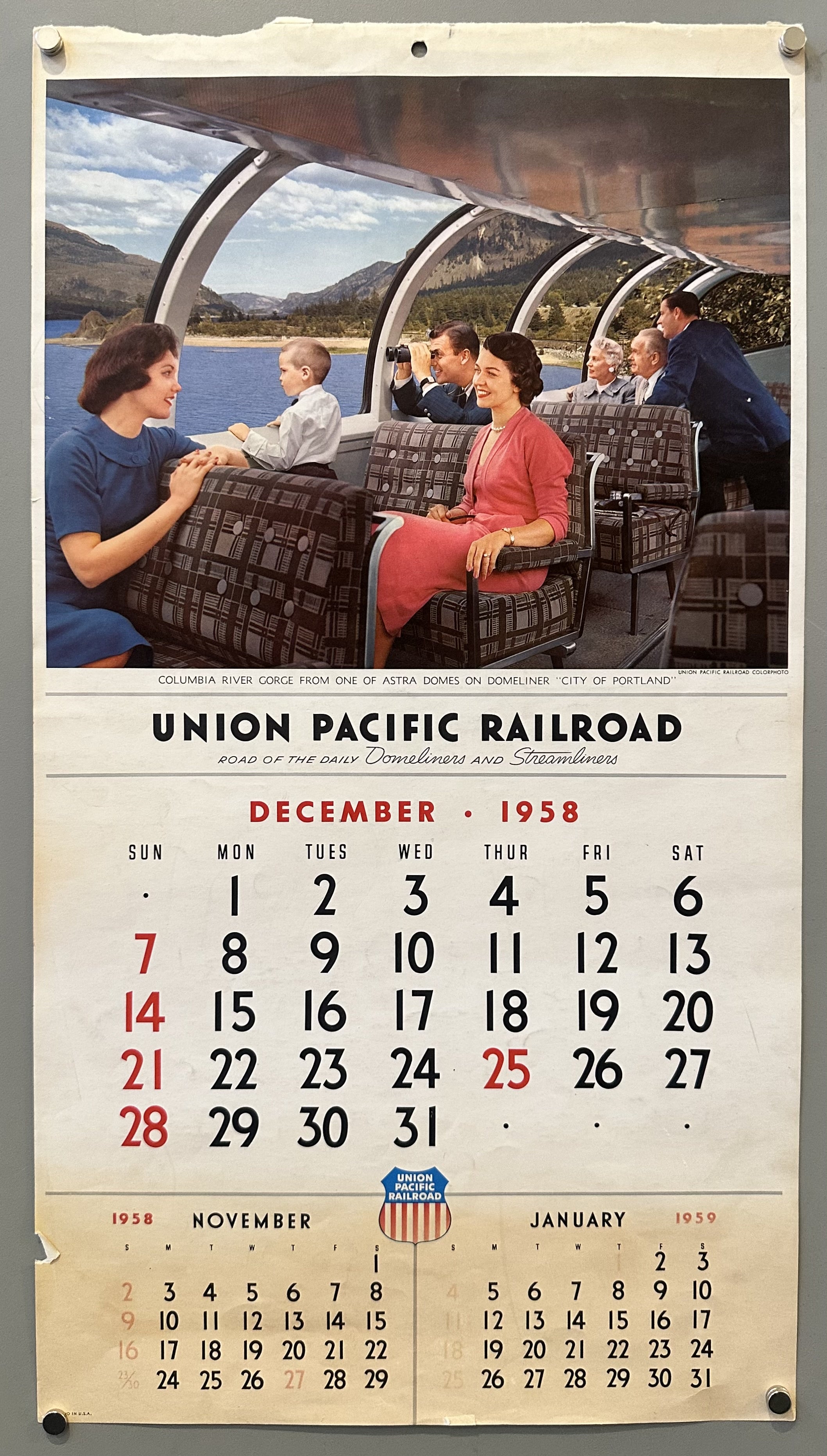 Vintage calendar from the Union Pacific Railroad, displaying the various destinations along the route. The front features "Columbia River Gorge from one of the Astra Domes on Domeliner's City of Portland." The back features "Domeliner 'City of Los Angeles,' in Weber County, Utah."