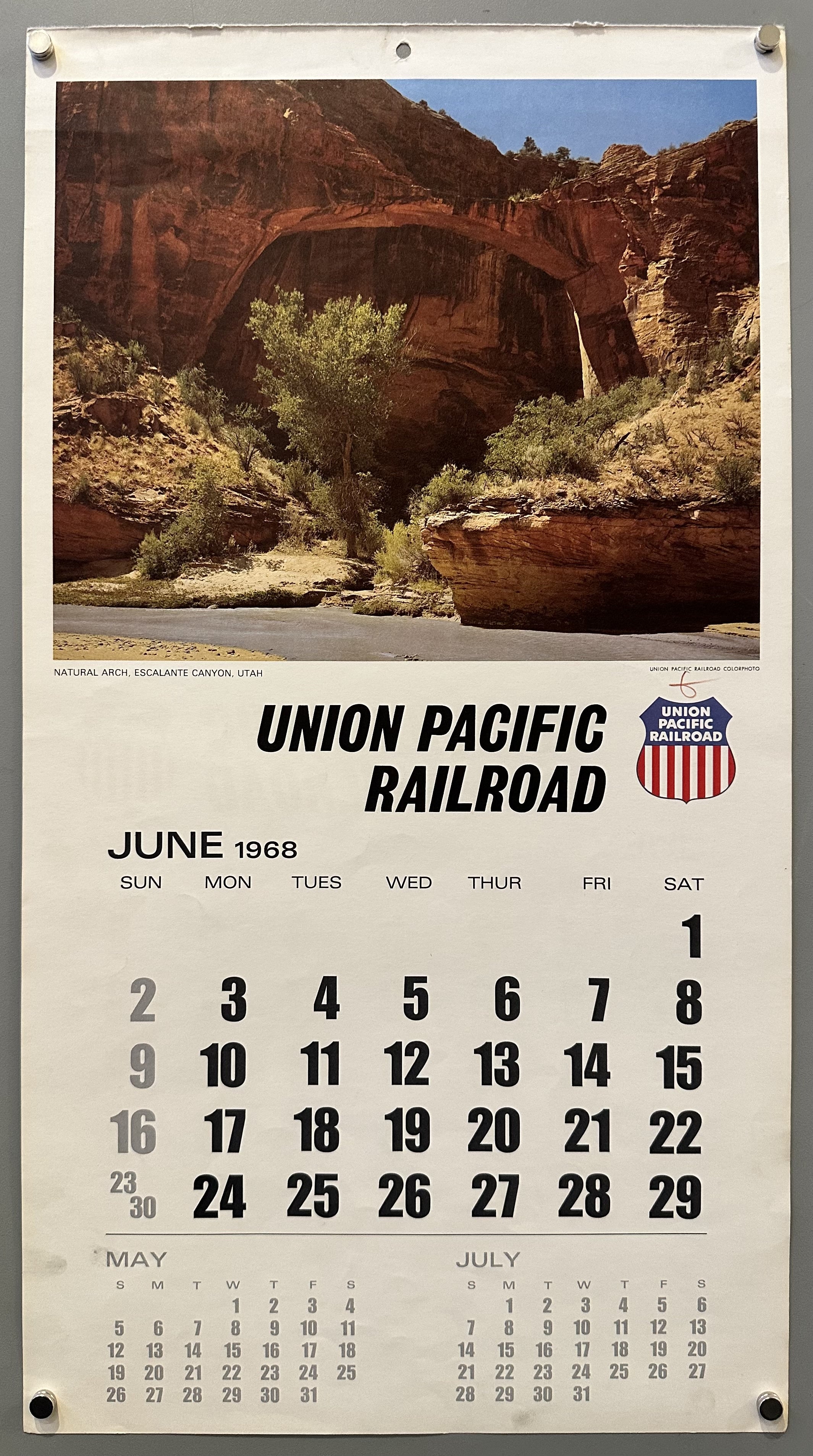 Vintage calendar from the Union Pacific Railroad, displaying the various destinations along the route. The front features "Natural Arch, Escalante Canyon, Utah." The back features "Castle Geyser, Yellowstone National Park."