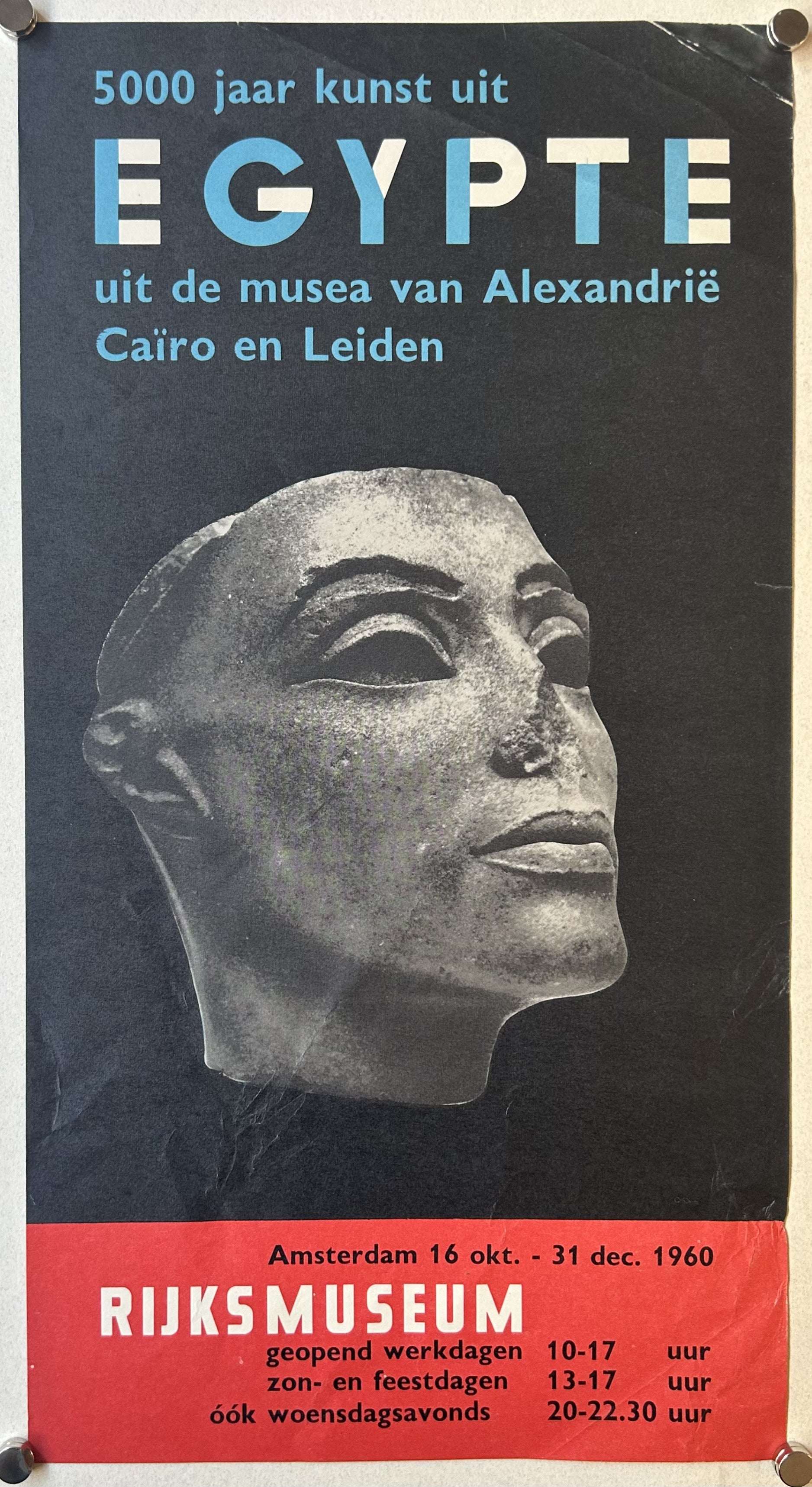 English translation: "5000 years of art from Egypt from the museums of Alexandria Cairo and Leiden / Amsterdam Oct 16 - December 31 1960 / Rijksmuseum / open weekdays 10 a.m. to 5 p.m. / Sundays and public holidays 1 to 5 p.m. / also Wednesday evenings 8 to 10.30 p.m."