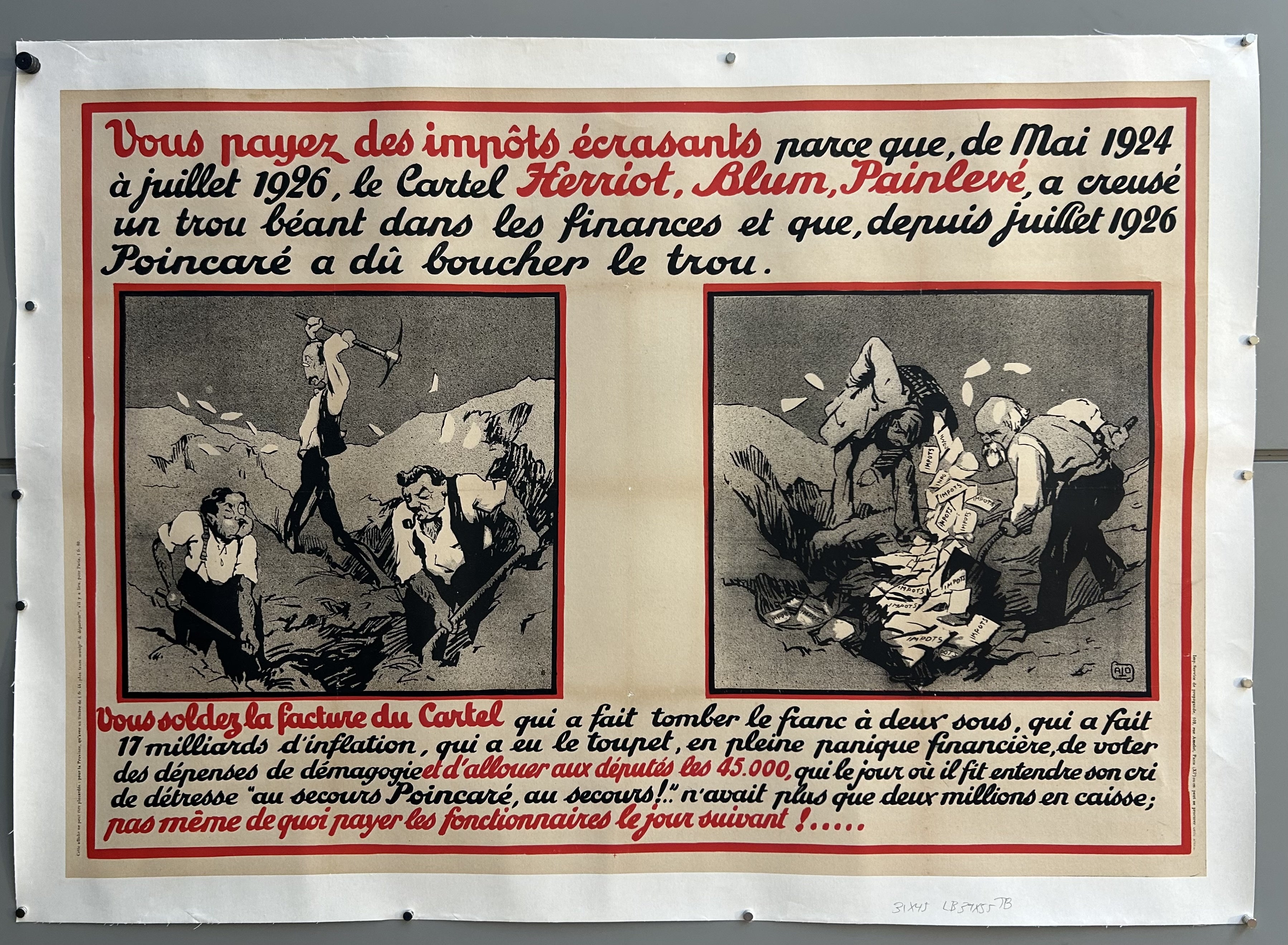 English translation: "You are paying crushing imports because from May 1924 to July 1926, the Herriot, Blum, Painleve Cartel dug a huge hole in the finances and, since July 1926, Pointcare has had to plug the hole."
