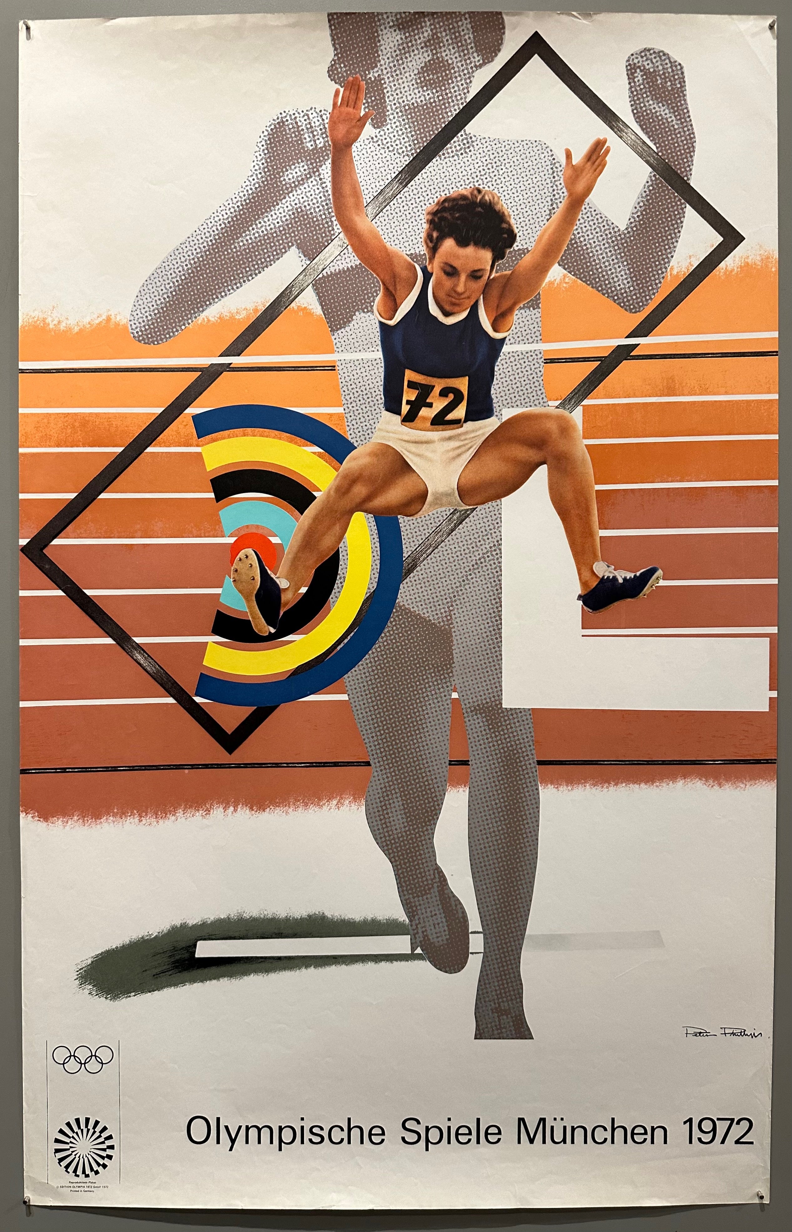 This poster is one of a series of 24 for the 1972 Munich Olympics. They were all created by popular artists of the time, and were linked to that particular artist's visual identity. The artists were told to avoid the use of any red and black on them (which were traditionally associated with Nazi Germany).