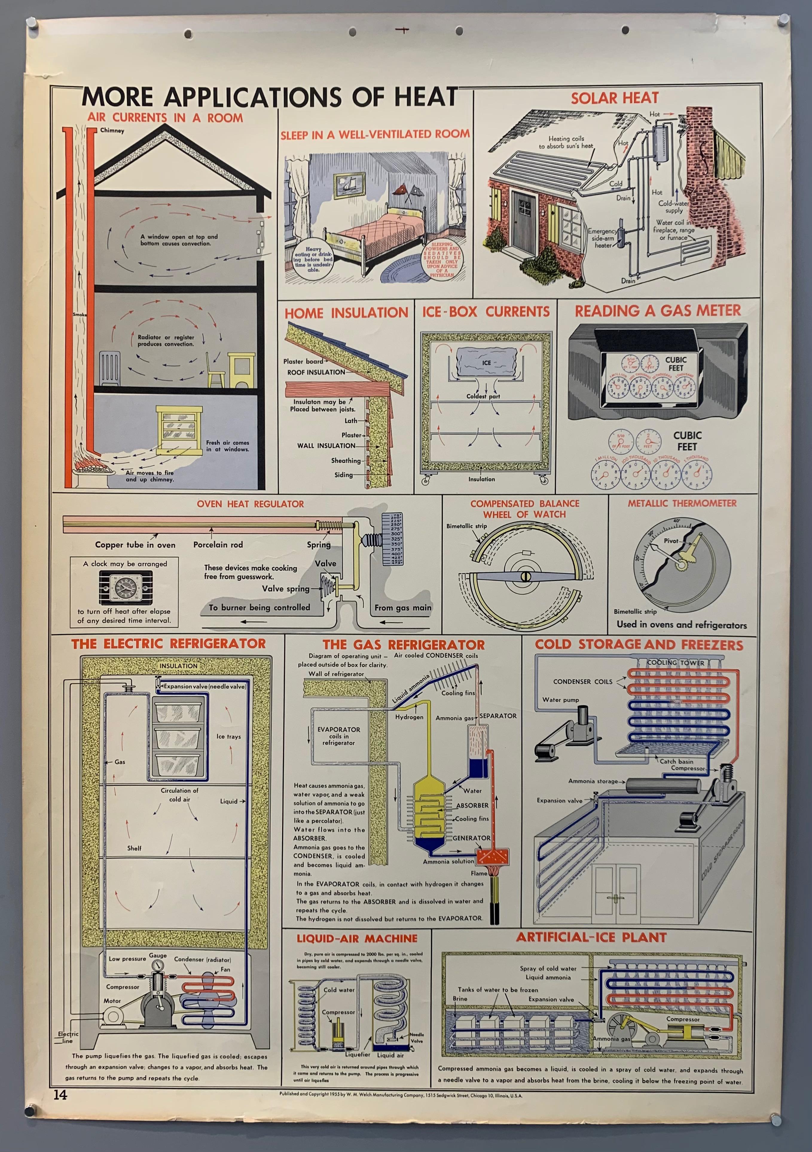 Description: Understanding heat has never been easier with this vintage 1950s wall chart with detailed illustrations and labels. This poster works as a quick and easy guide to learning about solar heat, refrigerators, and more.