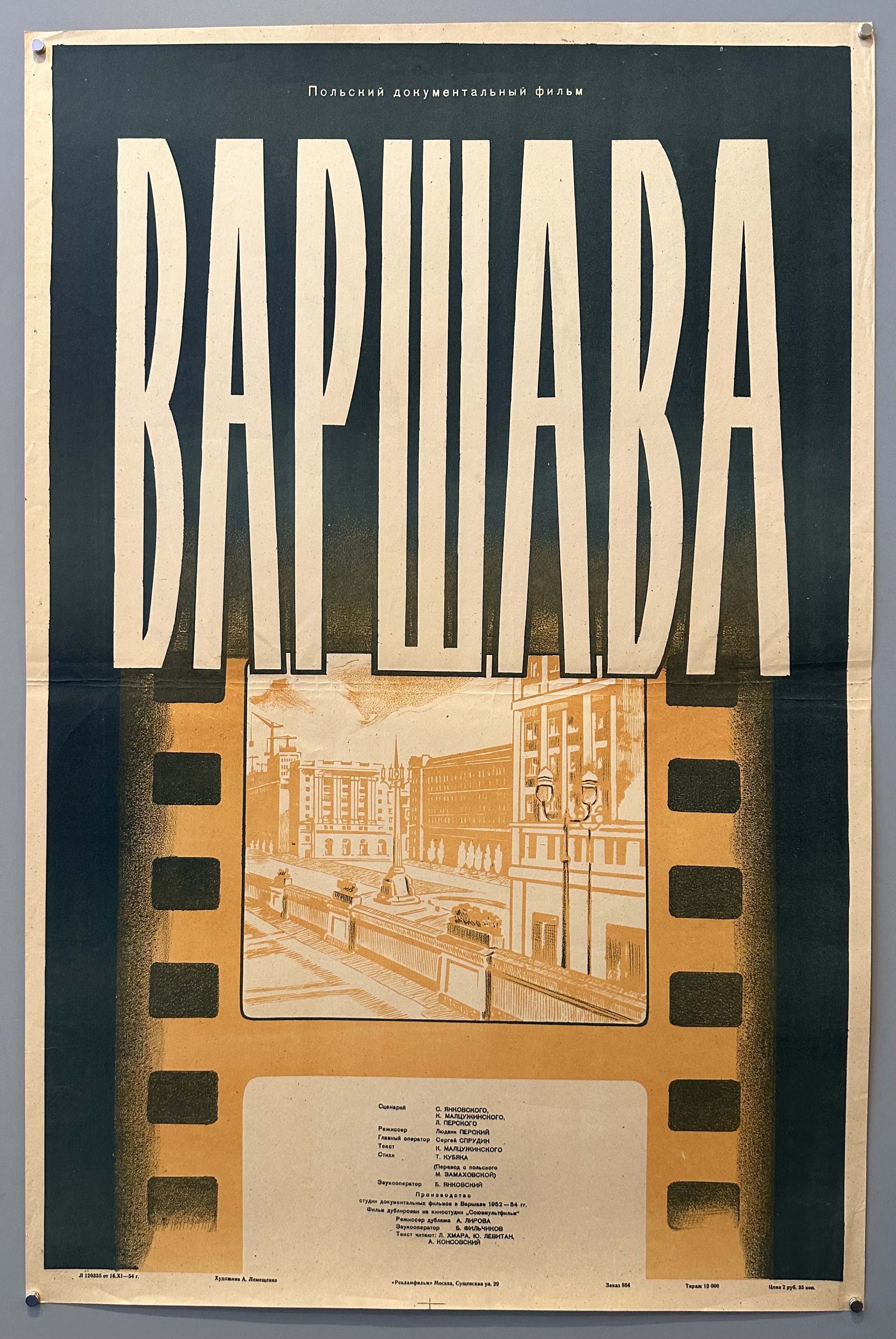 Russian poster for a documentary about Warsaw, Poland; Bapwaba (варшава) is the Russian name for this city. Directed by L. Perskii.
