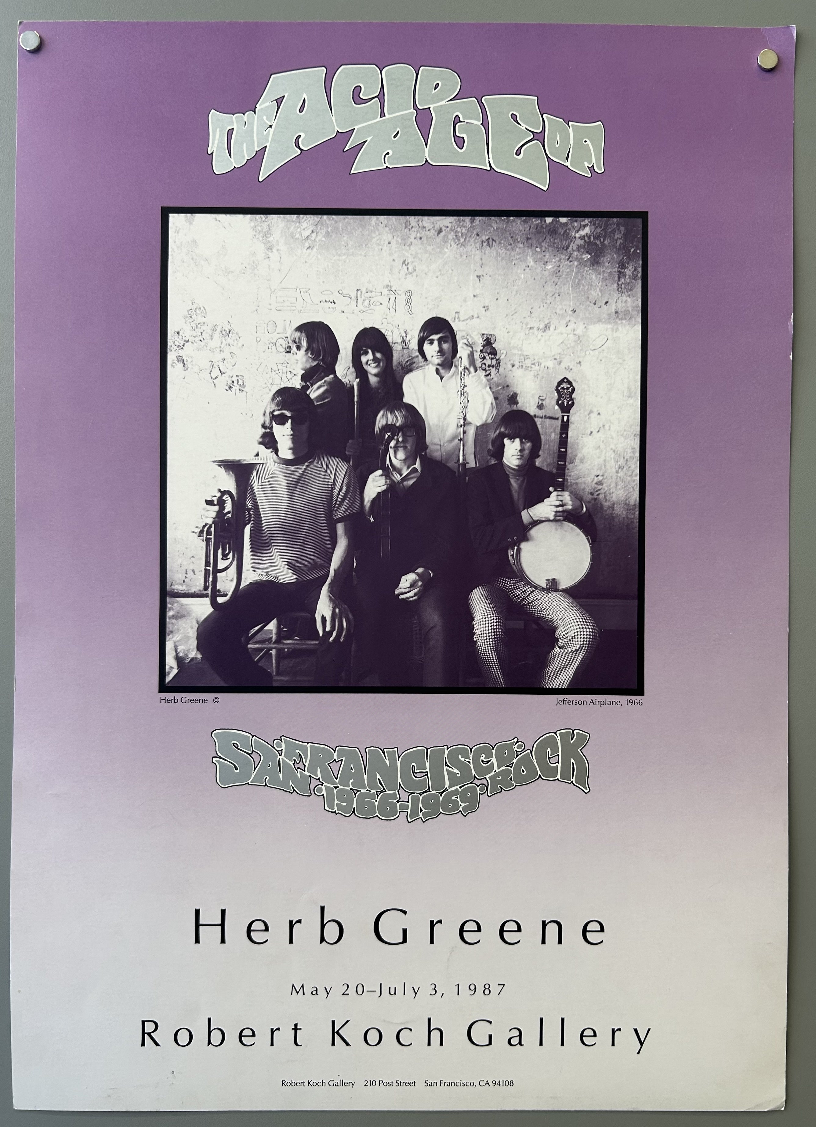 The poster announces an exhibition of photographs by Herb Greene, a renowned photographer known for his work documenting the San Francisco music scene and counterculture during the 1960s and 70s.
