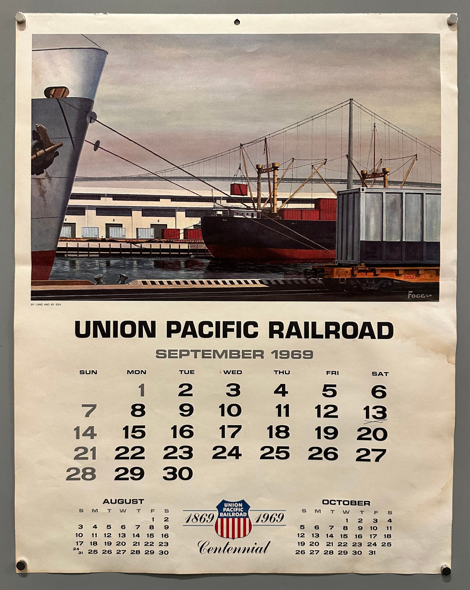 A double-sided calendar from Union Pacific Railroad with a painting entitled 'By Land and By Sea' on the back for the month of September.