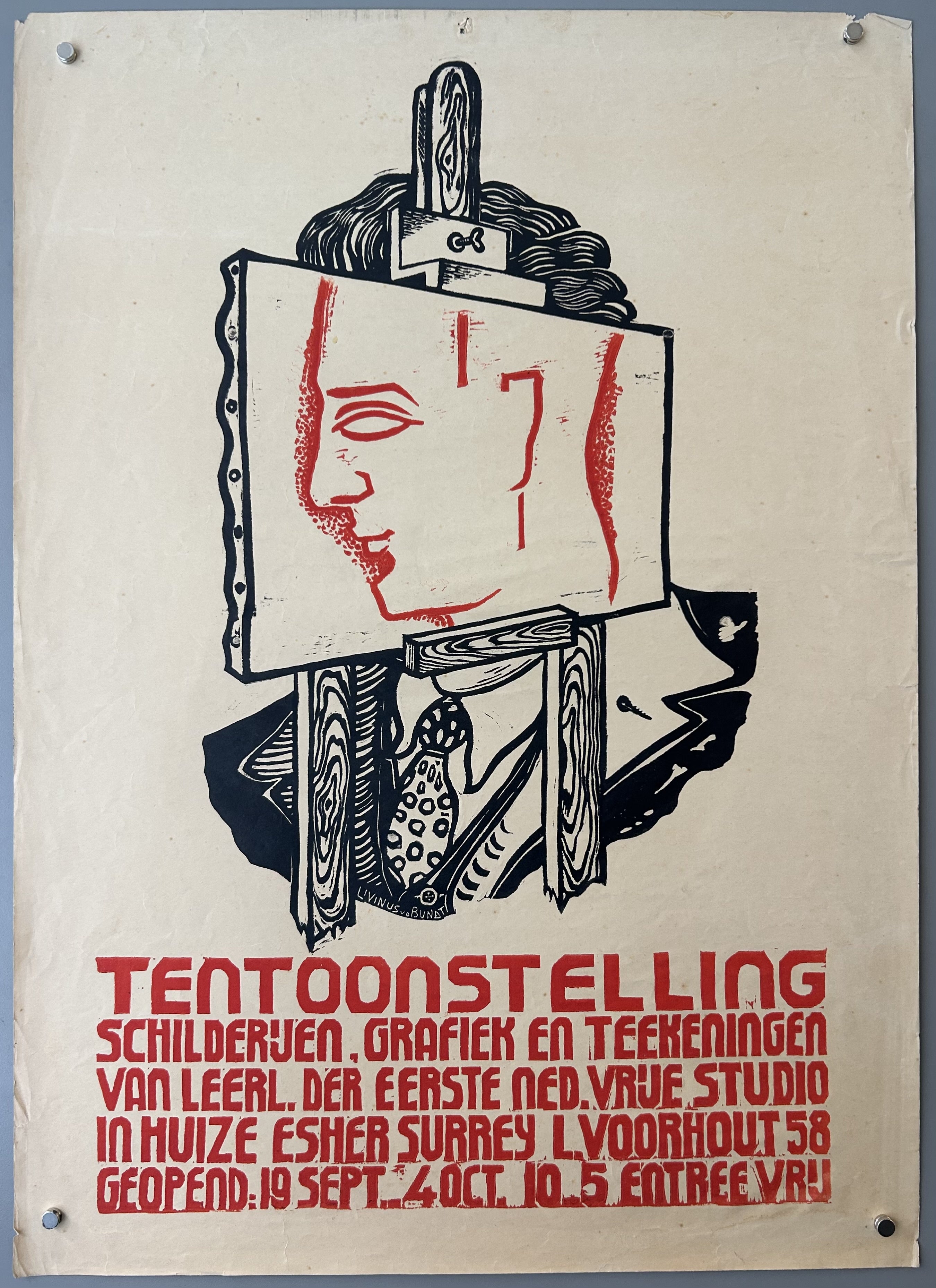 English translation: "Exhibition / Paintings, Prints, and Drawings by the Student of the First Dutch Free Studio at Esher House, Surrey"