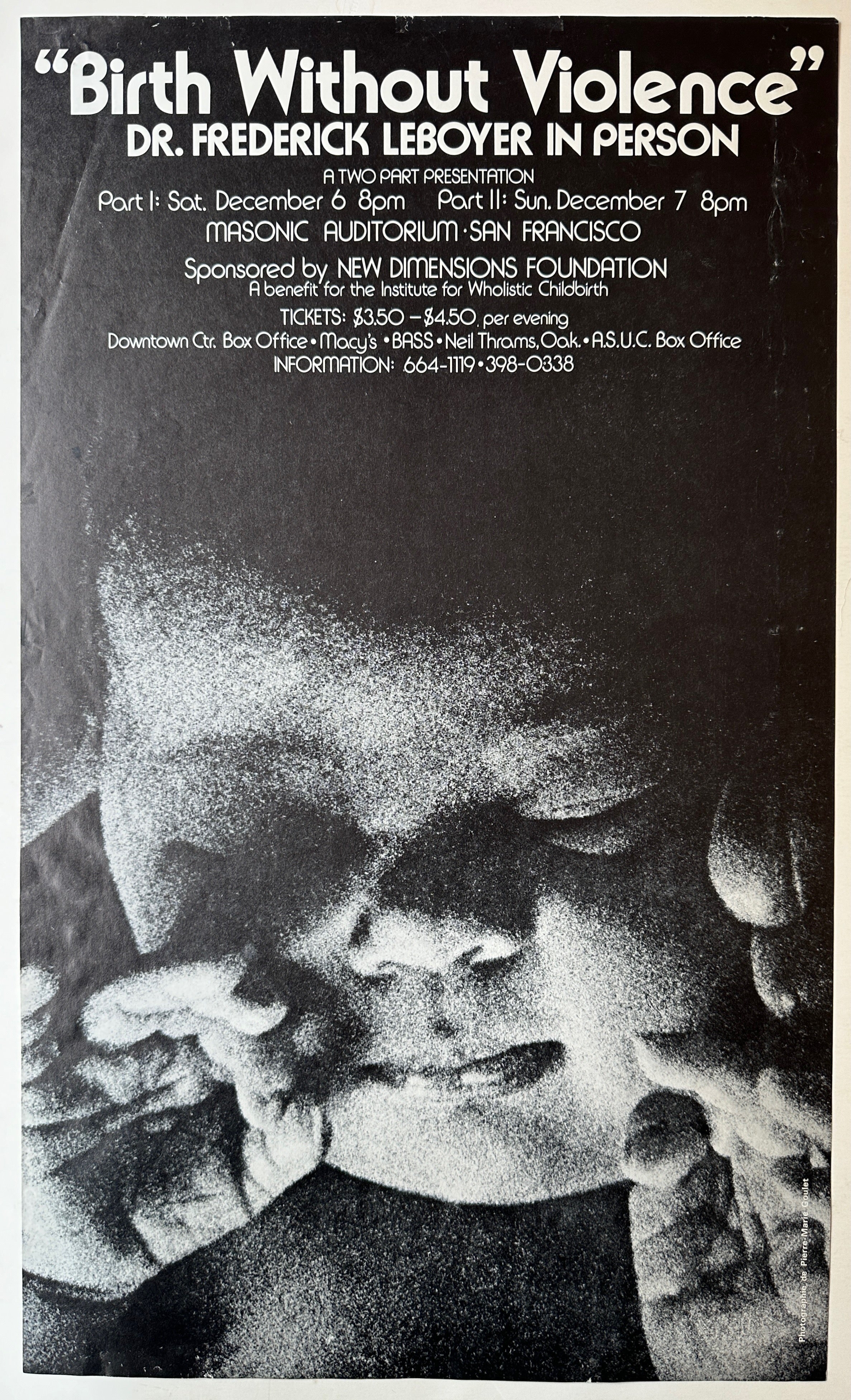 "'Birth Without Violence' Dr. Frederick Leboyer in Person / A Two Part Presentation / Part 1: Sat. December 6 8pm, Part II: Sun. December 7 8pm / Masonic Auditorium - San Francisco / Sponsored by New Dimensions Foundation / A benefit for the Institute for Wholistic Childbirth"