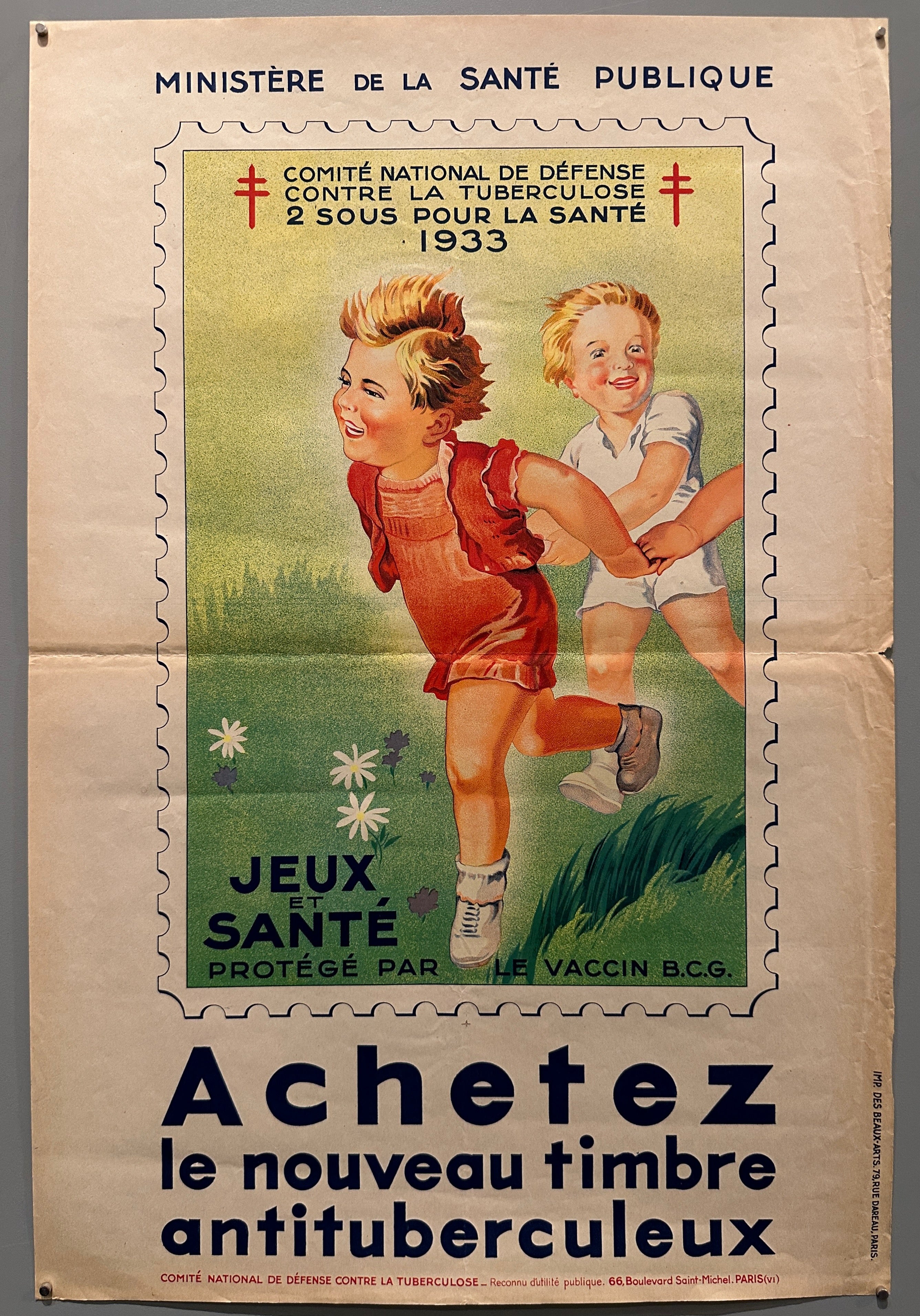 This poster promotes new stamps from the Committee for Defense Against Tuberculosis. The stamp features children gleefully playing with the translated caption reading: "Games and Health Protected by the B.C.G Vaccine". The stamps celebrated Albert Calmette's discovery of Bacillus Calmette-Guérin, used in the tuberculosis vaccine.