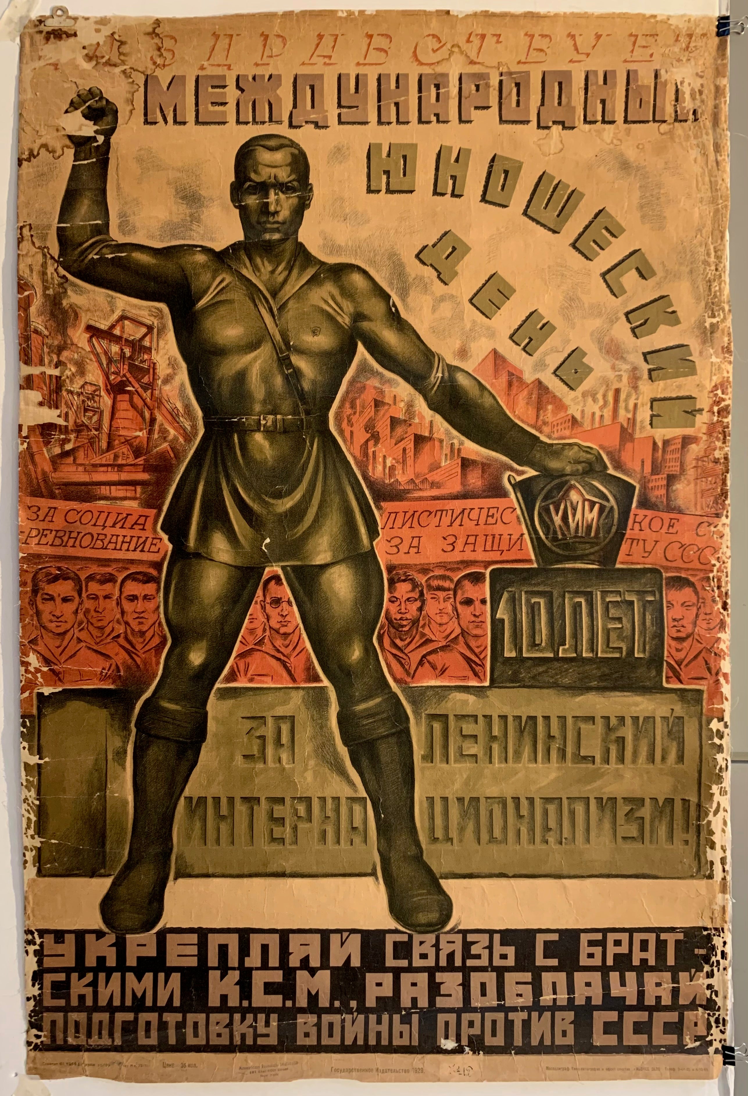 This brilliant historical artifact is a propaganda piece made 10 years after the founding KCM, the youth communist union of the USSR. A muscular bronzed man stands in the forefront while behind him, rows of young men and thriving industries line up. Meant to promote the USSR's socialist agenda, the message, even for non-Russian speakers, is quite clear. This is an original poster that is quite rare.