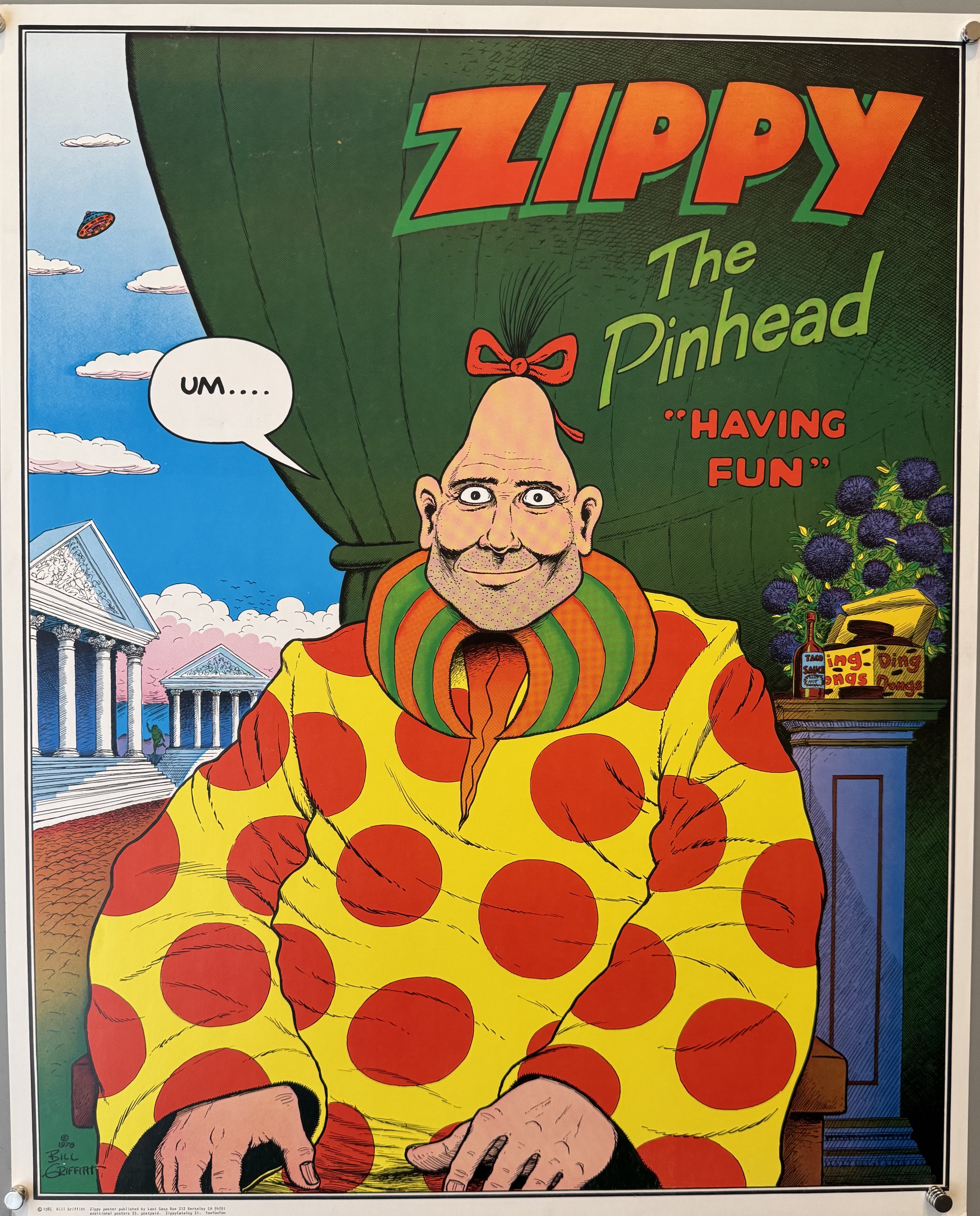 Promotional poster for Zippy, an American comic strip created by Bill Griffith. Zippy's most famous quotation, "Are we having fun yet?" became emblematic of the underground comic strip.