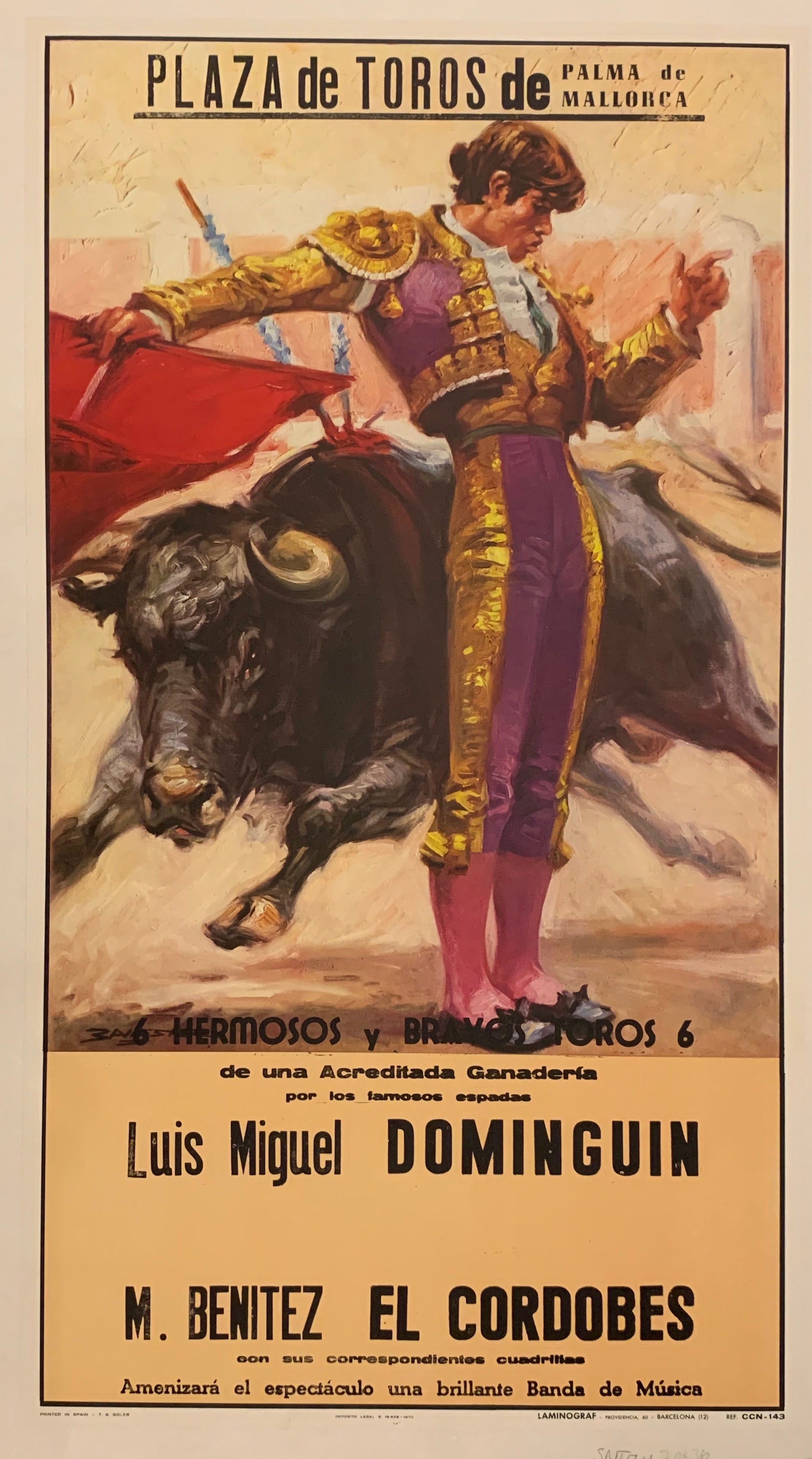 A marvelous poster advertising a Spanish bullfight in Mallorca that included the famous bullfighters Luis Miguel Dominguín and El Cordobés.