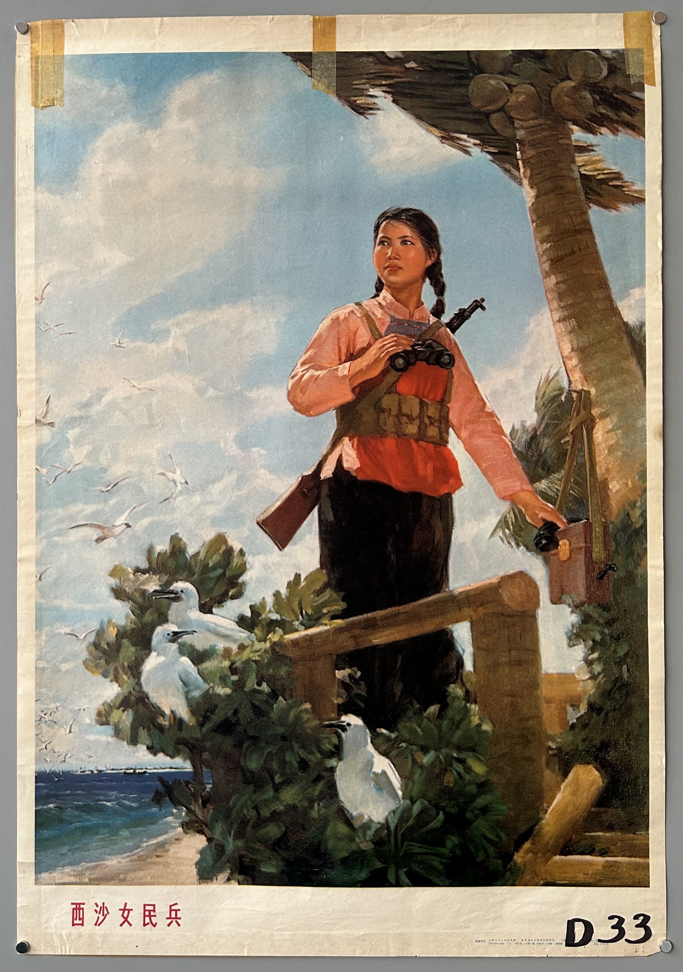A propaganda poster depicting a female soldier keeping a lookout on the South China Sea.