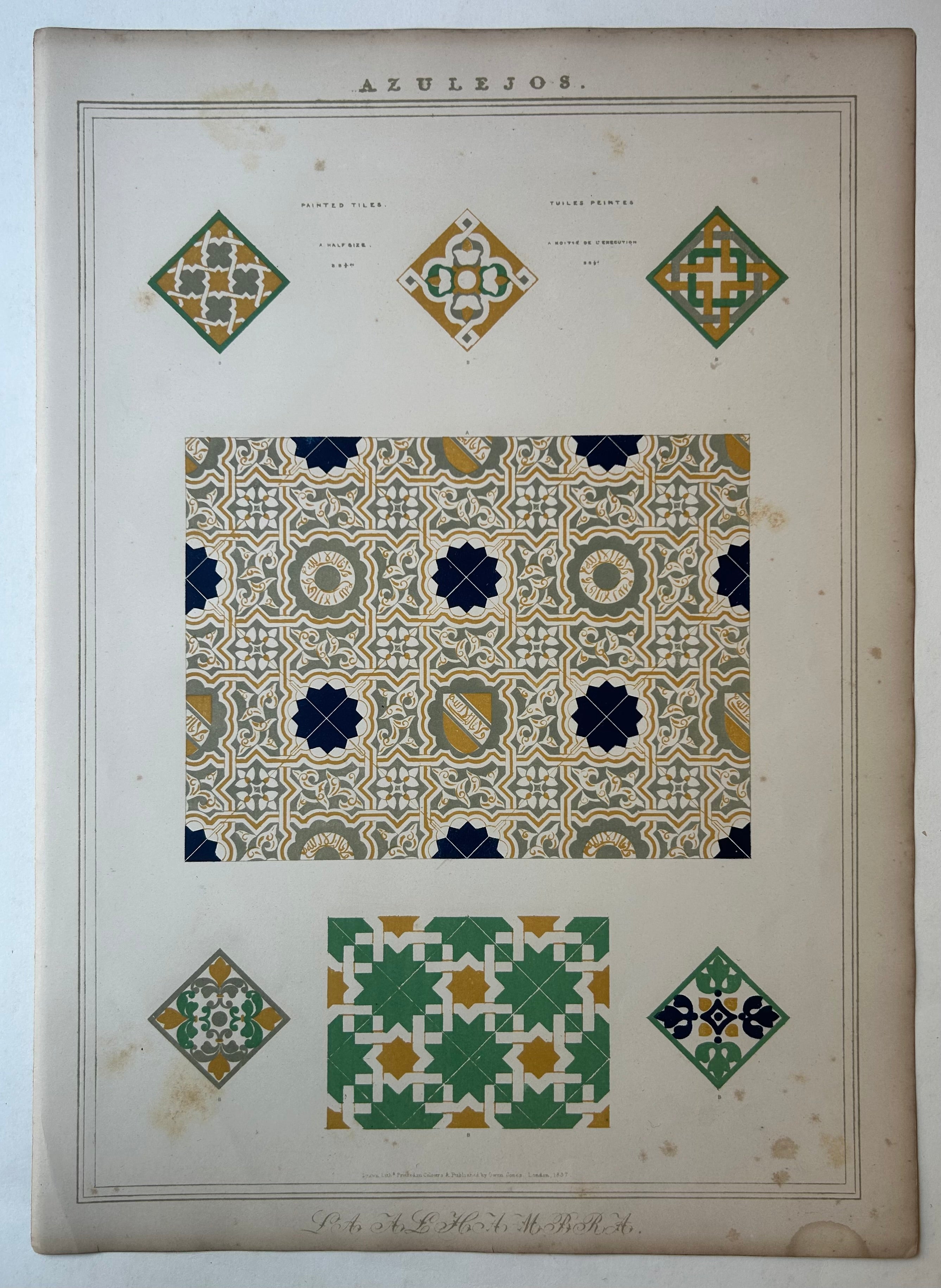 This print comes from a compilation of plans, elevations, sections and details or the famous Alhambra. The Alhambra is a feat of Islamic architecture, a palace in Grenada, Spain. This book was created from the drawings of architects Jules Goury and Owen Jones. Jones was known for his eye for design and is often attributed with being a pioneer of modern color theory. His attention to detail is recognized in his works in this compilation. The works of Goury included in this compilation were drawings done on site at the Alhambra in 1834.