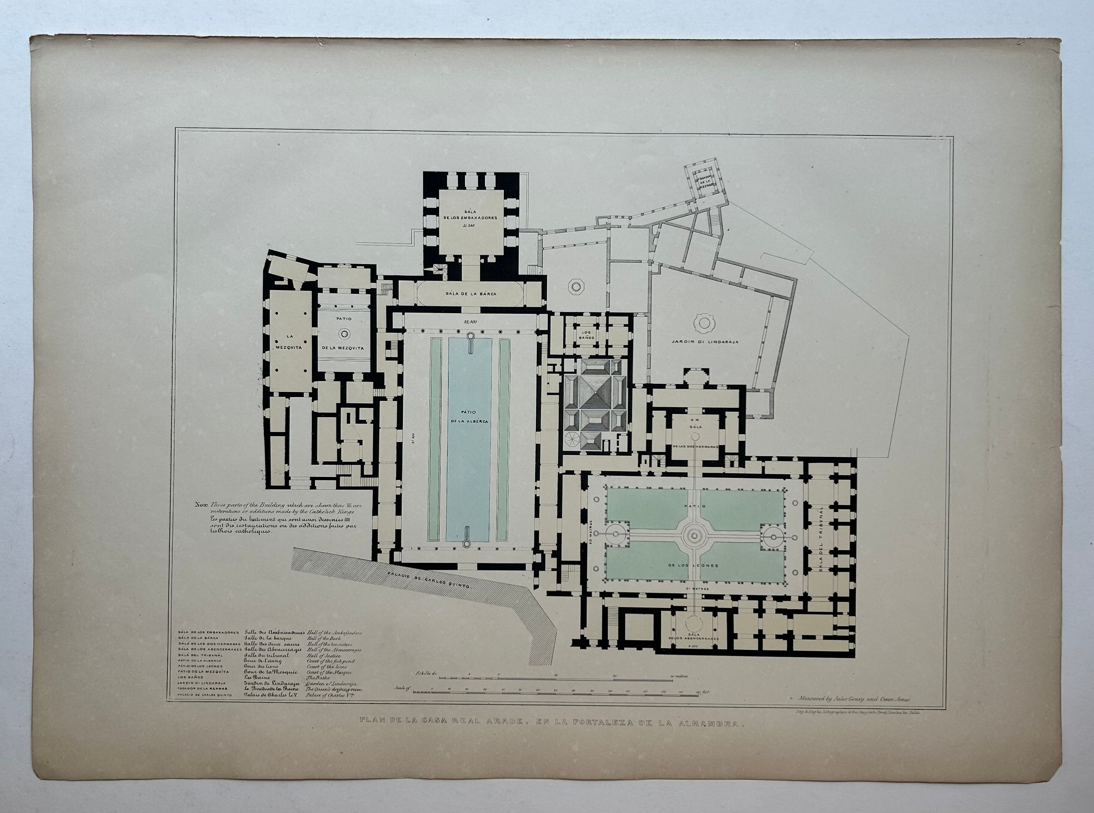 This print comes from a compilation of plans, elevations, sections and details or the famous Alhambra. The Alhambra is a feat of Islamic architecture, a palace in Grenada, Spain. This book was created from the drawings of architects Jules Goury and Owen Jones. Jones was known for his eye for design and is often attributed with being a pioneer of modern color theory. His attention to detail is recognized in his works in this compilation. The works of Goury included in this compilation were drawings done on site at the Alhambra in 1834.