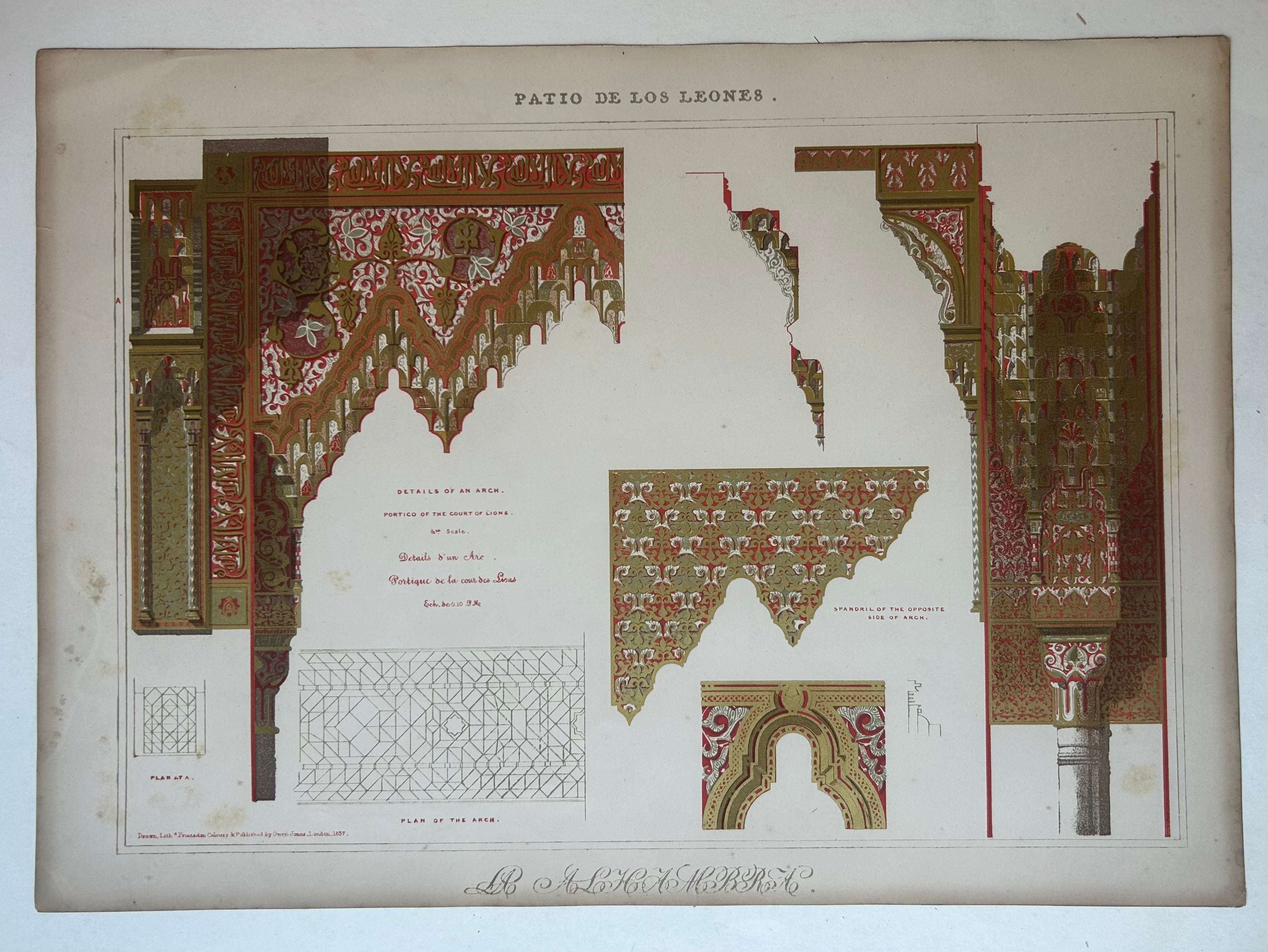 This print comes from a compilation of plans, elevations, sections and details or the famous Alhambra. The Alhambra is a feat of Islamic architecture, a palace in Grenada, Spain. This book was created from the drawings of architects Jules Goury and Owen Jones. Jones was known for his eye for design and is often attributed with being a pioneer of modern color theory. His attention to detail is recognized in his works in this compilation. The works of Goury included in this compilation were drawings done on site at the Alhambra in 1834.